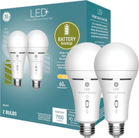Introducing the GE LED+ Battery Backup LED Light Bulbs with a built-in flashlight! Combining the efficiency of LED technology with the flexibility of battery power, this multifunctional light bulb is your reliable light source for both every day use or use during power outages. What sets them apart is their built-in battery backup feature. When the power goes out, these bulbs will remain on ensuring uninterrupted lighting for hours on end. Right after you screw in the bulb its important to keep the light on for 10 consecutive hours to completely charge the battery. Now your bulb is ready to use in case of a power outage and will easily recharge every time the light is on. But that's not all - our LED light bulbs also come equipped with a convenient built-in flashlight function. Simply turn off the switch and unscrew the bulb from its socket, switch the bulb to flashlight position and you have an instant handheld flashlight at your disposal. Whether you're navigating through a dark hallway or searching for supplies in your garage, our flashlight bulb has you covered. Designed for durability and longevity, our LED bulbs are built to last, saving you money on replacements and reducing environmental waste. Plus, their compatibility with an E26 medium-base standard light sockets makes them easy to install and use in any room. Its everything you love about LED, plus a power problem solution.