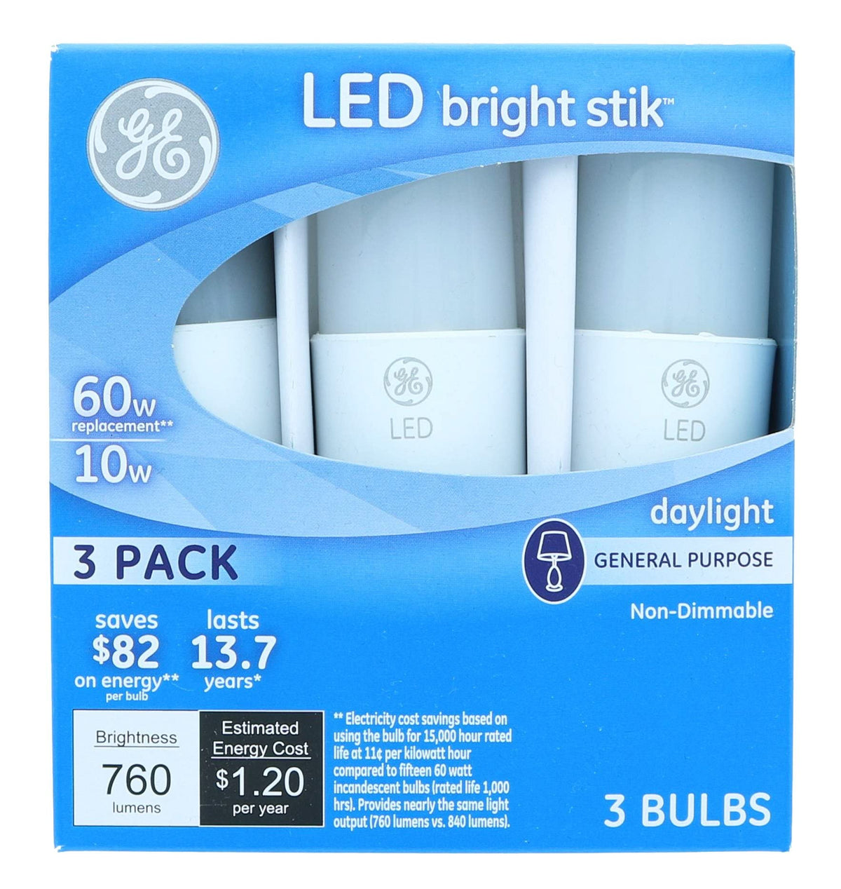 GE LED Bright Stik 10W Light Bulb, 760 Lumen, Daylight, Medium Base, 3 Count, Model 32287