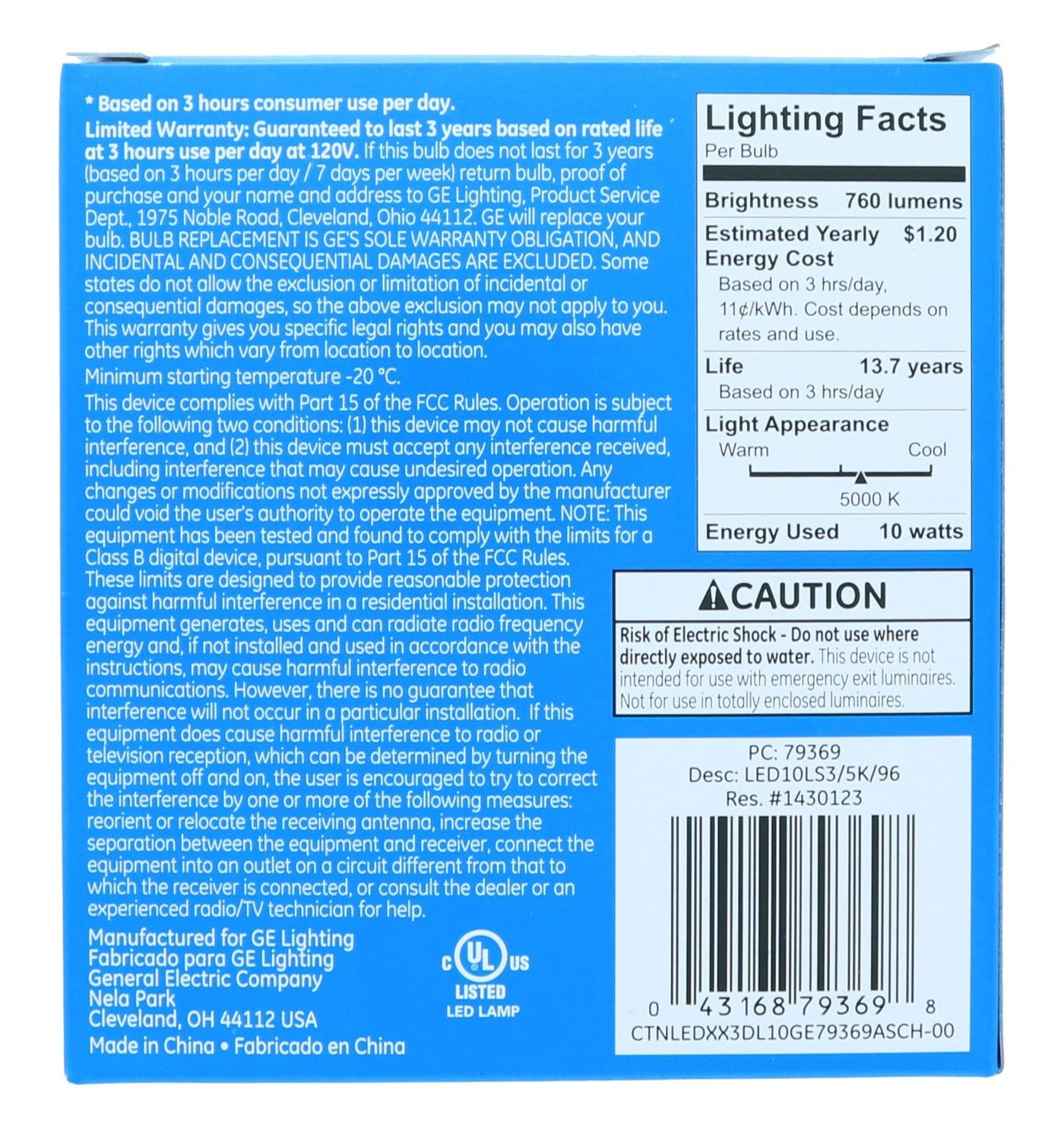 The GE LED10LS/5K-3P/OT is an excellent choice for homeowners, office spaces, and retail environments looking for reliable and efficient lighting solutions. With its combination of energy efficiency, brightness, and durability, this LED bulb pack offers exceptional value for anyone seeking to enhance their indoor lighting while reducing energy costs.