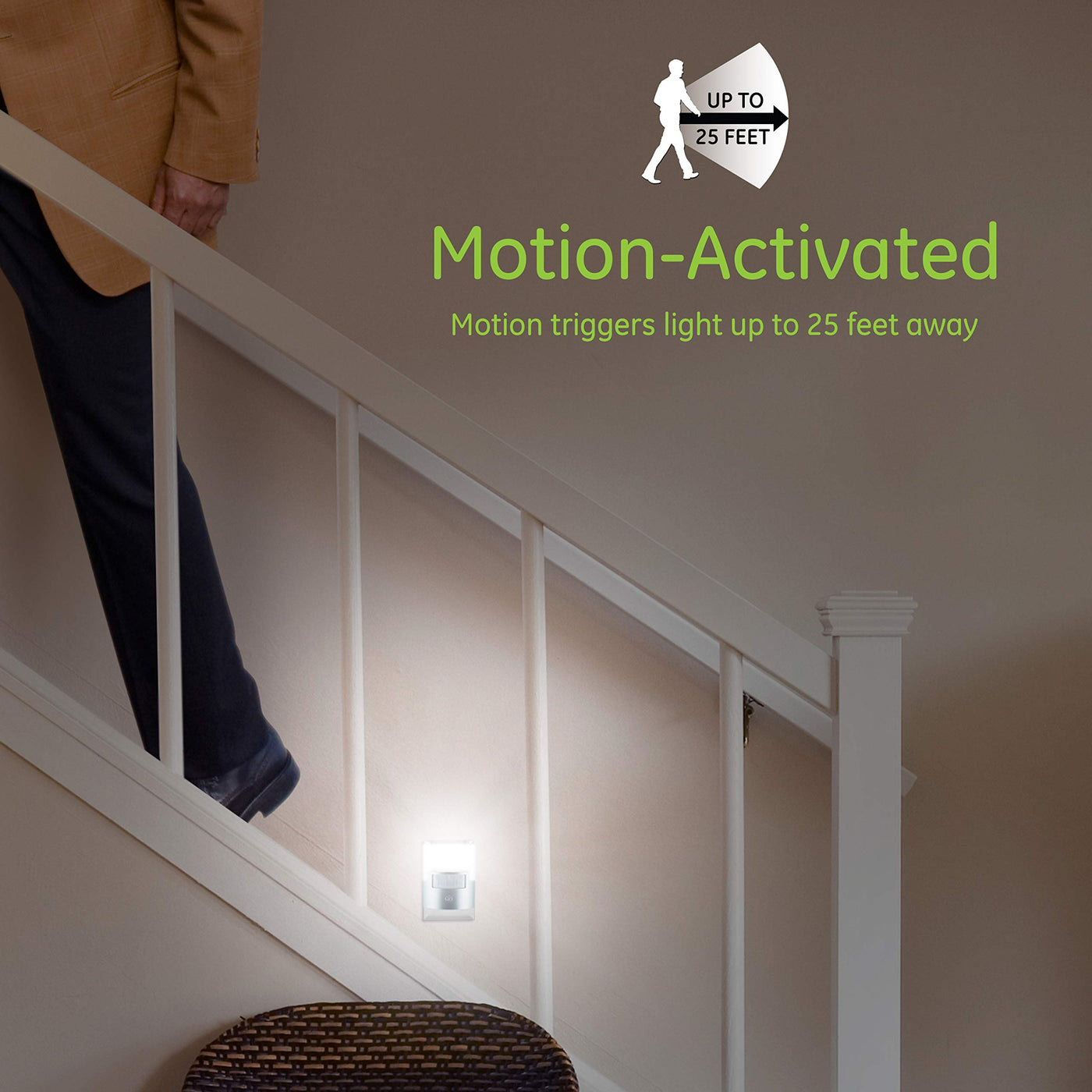 Q: How does the GE LED Motion Sensor Night Light work?A: The GE LED Motion Sensor Night Light uses motion-sensing technology to automatically turn on when it detects movement from up to 25 feet away. It will turn off after 90 seconds of no activity, ensuring energy efficiency.