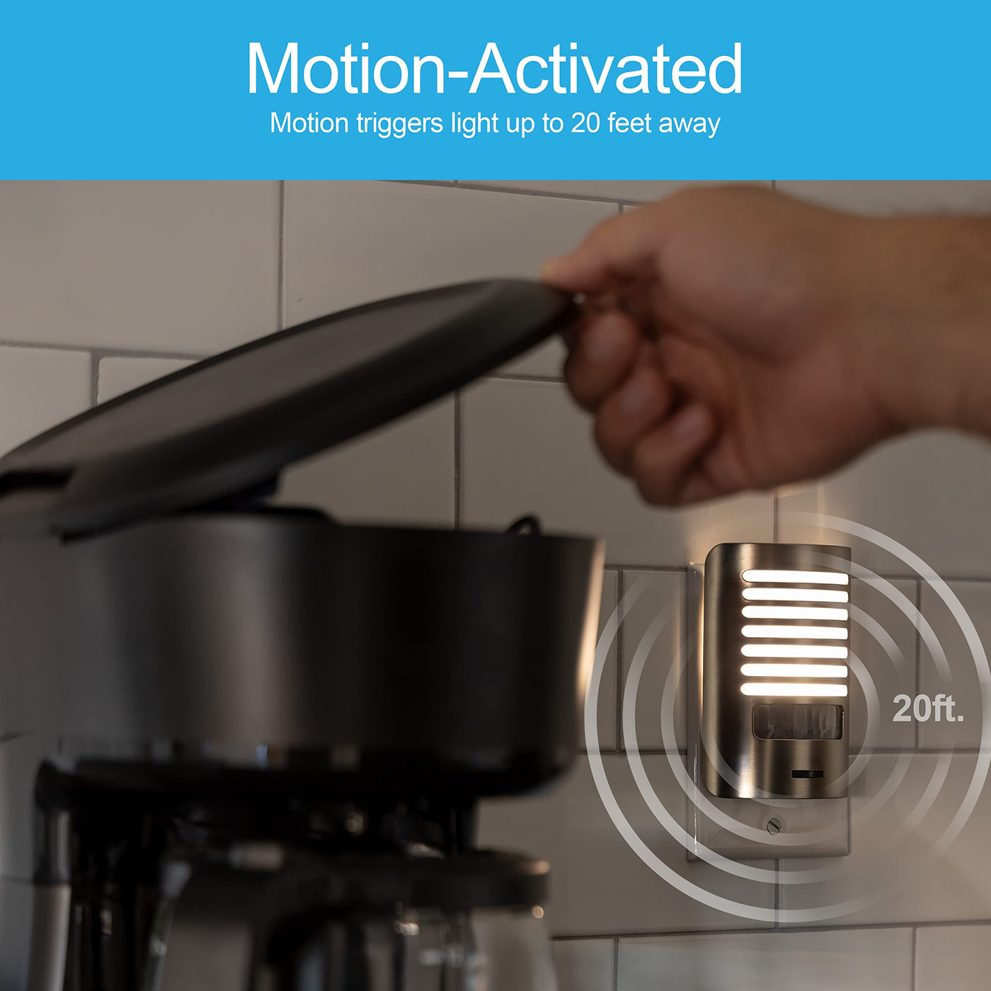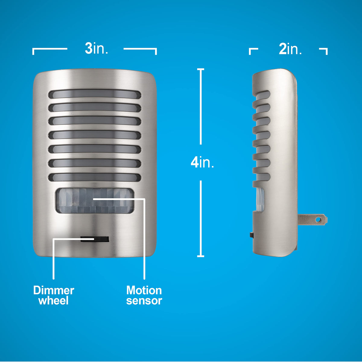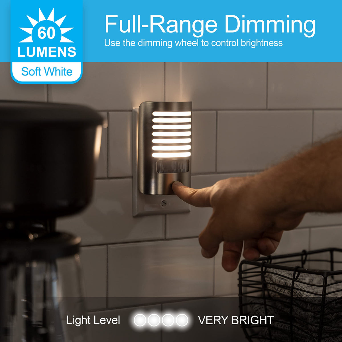 Illuminate Your Home The Way You Want With The Ge-Branded Motion-Sensing Dimmable Night Light. Featuring An Elegant Louver-Shade Design With A Brushed Nickel Finish, This Night Light Guides Your Way While Enhancing The Room? D?Or. Perfect For Evening Routines And Late-Night Bathroom Visits, The 20Ft.-Range Motion Sensor Automatically Illuminates The Area When You Approach. The Soft White Light Is Perfect For Guiding You In The Dark And Can Be Adjusted Using The Built-In Scroll Wheel - A Dim Glow To A Bright 60 Lumens. Giving You Light Only When You Want It Is Important, This Is Why The Night Light Only Activates When The Room Is Already Dark. Plus, The Motion Sensor Will Turn The Light Off Again 90 Seconds After Movement Ends. Created With An Off-Set Plug, You Can Cover An Entire Outlet For A Fully Integrated Look Or Leave The Second Receptacle Open For Other Electronics. Great For Bedrooms, Hallways, Bathrooms, Offices, Playrooms, Living Rooms And More, The Ge-Branded Motion Sensing Dimmable Led Night Light Is The Ideal Way To Illuminate Your Home.