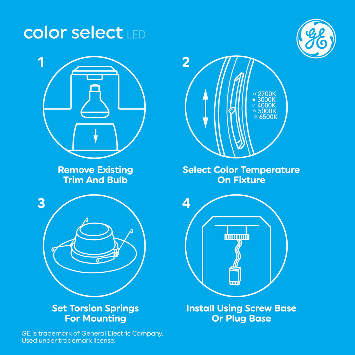 Q: What color temperatures are available for these downlight fixtures?A: The GE LED Recessed Downlight Fixtures feature a color select option, allowing you to choose between Soft White, Warm White, Cool White, Daylight, and Cool Daylight to create the perfect lighting environment in your home.
