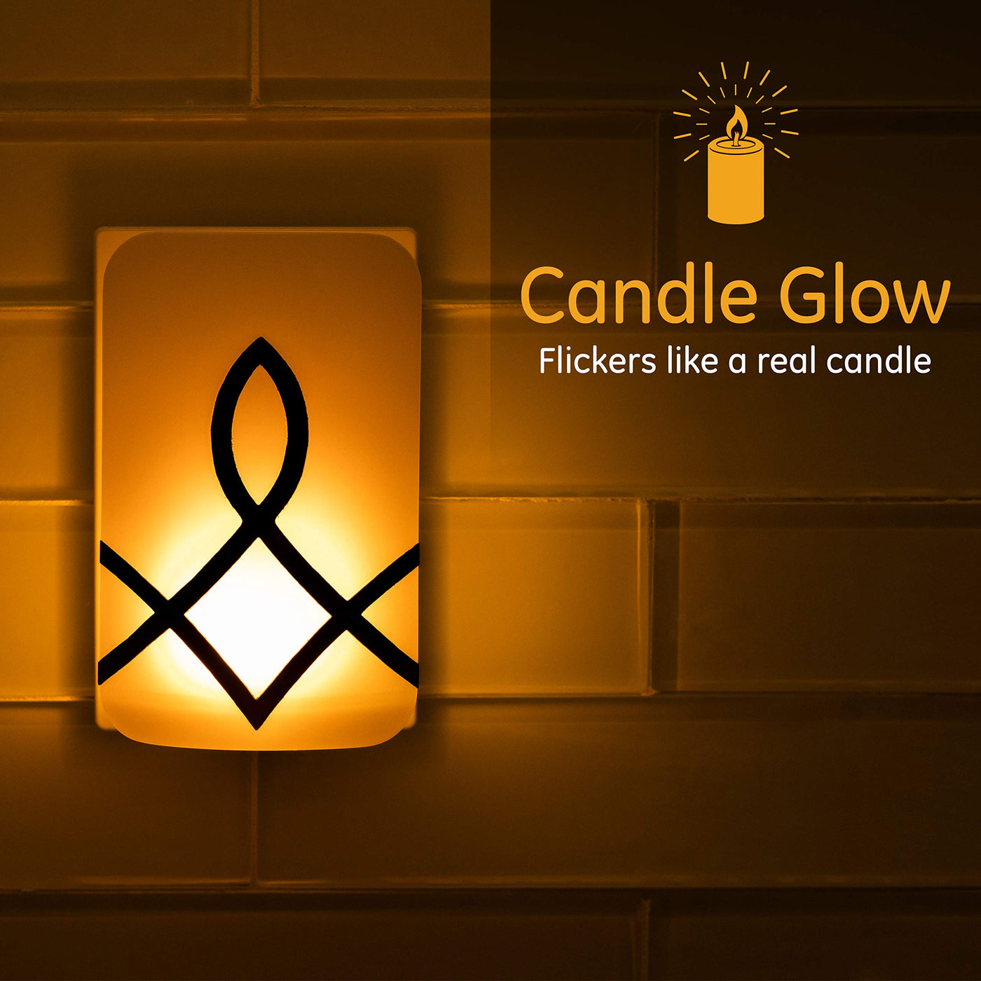 This GE branded LED Sleep Lite with Candle Glow combines the beauty of candlelight with the benefits of LED technology. The elegant design houses soft, energy-efficient LEDs that glow through the night. Choose from a flickering effect that simulates a candle, regular amber or soft white in high or low brightness settings. The amber Sleep Lite setting also promotes better sleep by doing away with the all-too-common blue light, which throws off our circadian rhythms. Set an elegant and restful mood with the GE branded LED plug-in Sleep Lite with Candle Glow.