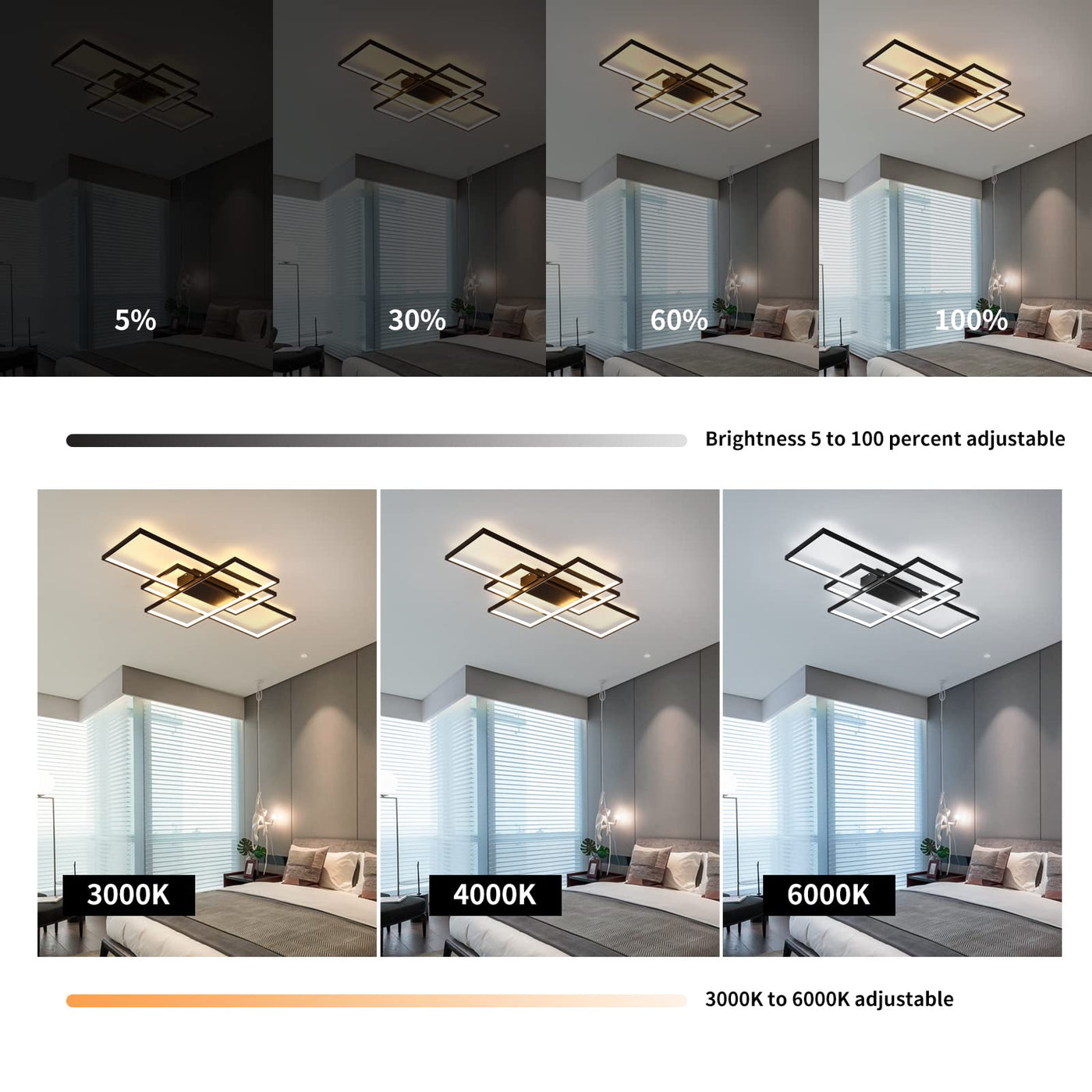 Q: Can the brightness and color temperature be adjusted on this chandelier?A: Yes, the chandelier features stepless dimming, allowing you to adjust both brightness and color temperature between 3000K and 6000K using the included remote control.
