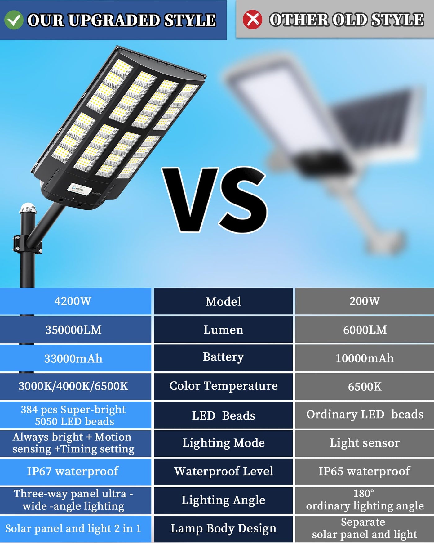- **High-Performance LED Technology**: Equipped with 384 ultra-bright 5050 type LED beads, each Gefolly bead emits light equivalent to 20 conventional beads. With a 300-degree wide-angle lighting, this street light can illuminate an impressive area of up to 3400 square feet, significantly reducing blind spots.
