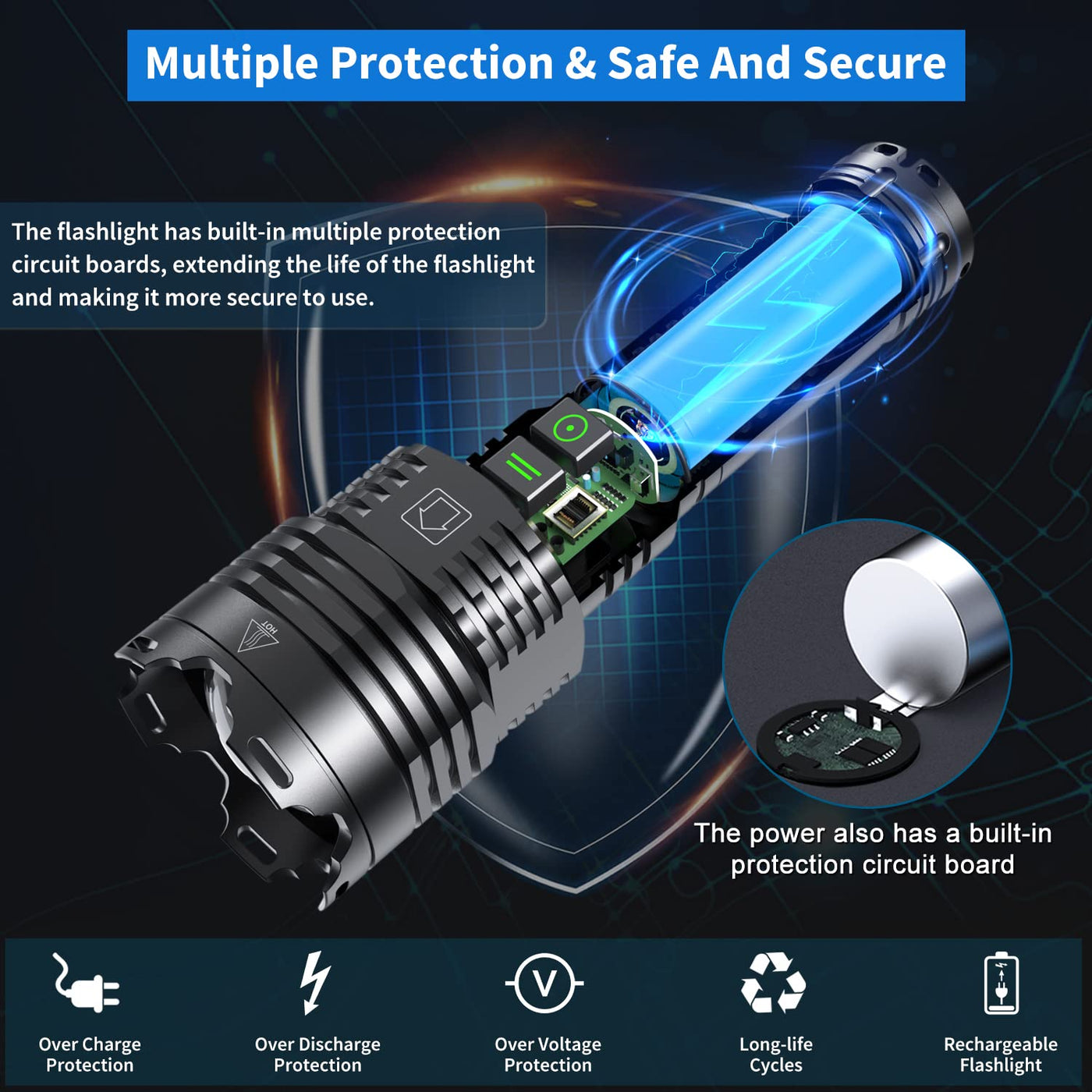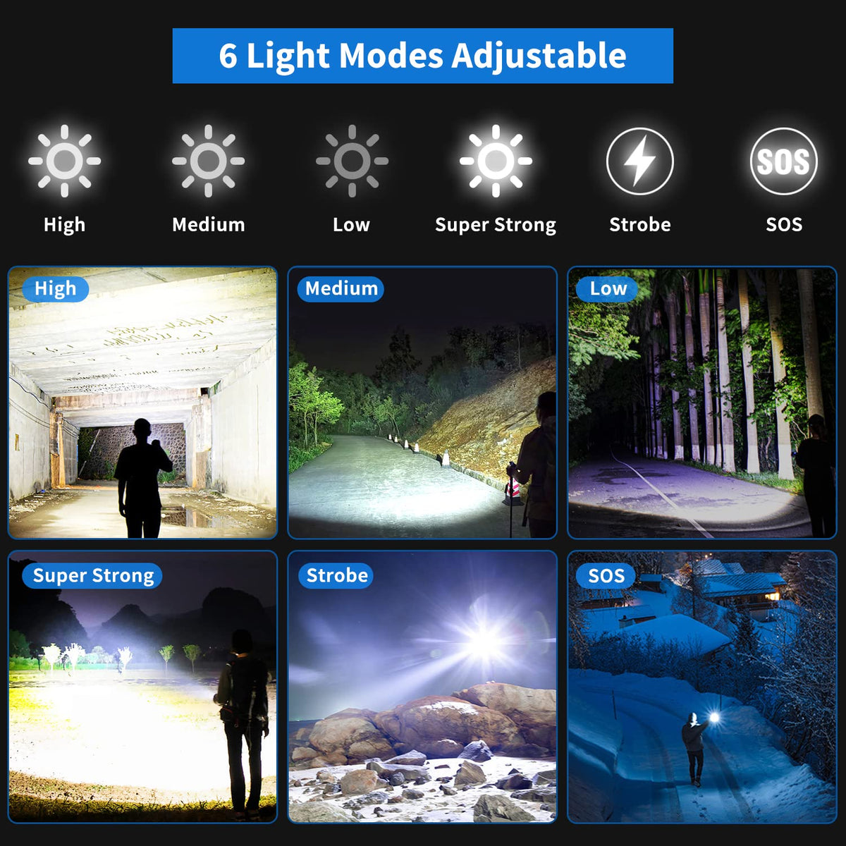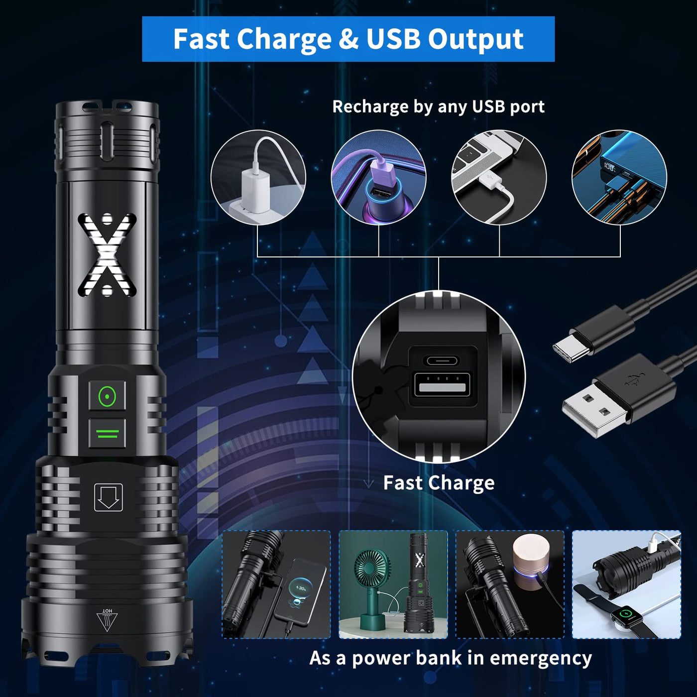 gehavin LED XHP1605 Rechargeable Flashlight core Functions 1 Super Bright:The brightness of the upgraded LED chip is up to 150000 lumens and the range is up to 1000 meters 2 Multi Mode Selectable:6 lighting modes are available, which are suitable for camping, night fishing, emergency and other occasions It is one of the necessary tools for all families 3 Telescopic Zoom: Zoom-in is suitable for large area lighting, Zoom-out is suitable for finding objects from a long distance Zoom-in& Zoom-out can be freely switched according to the occasion of use 4USB Input & Output Ports:The advantage of gehavin 150000 lumen flashlightAs USB is that the charging speed is faster, the charging port is not easy to wear and more durable It also has a power output function, so you can use it as a mobile power supply to charge your device through the cable XHP1605 LED Super Bright Flashlight This 150000 lumen LED flashlight uses an advanced xhp1605 LED chip, which is stable and super bright It is 20 times brighter than an ordinary flashlight and easily lights up a 3000 square foot room The maximum beam distance can reach 1000 meters Zoomable Bright Flashlights By zooming in and out, you can switch between spotlights and floodlights Zoom out the led rechargeable flashlight to collect light to a range of 1000 meters, then zoom in to increase the illuminated area and get a maximum brightness of 150000 lms Fast charge The advantage of the charging port of the gehavin emergency flashlights is that the charging speed is faster and the charging port is not easy to wear out It also has power output, so you can use it as a power bank to charge your device via the cable Shock Resistant gehavin high lumen flashlight is made of explosion-proof aluminum alloy The safety and explosion-proof characteristics of aluminum alloy make it also suitable for gas stations, power stations, chemical plants, airports, warehouses, gas plants and other working environments Power Rem
