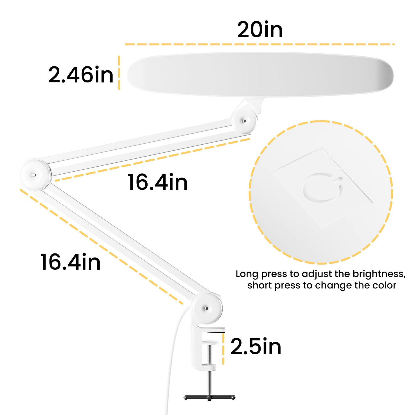 Advanced Task Lighting Solution - The Gelpal 3000 Lumens LED Clamp Lamp is designed for precision and versatility, ideal for professionals, hobbyists, and nail technicians. Its durable design suits environments like offices, workshops, nail salons, and reading areas. The lacquered finish adds a modern look while enhancing durability, making it a reliable choice for various tasks. | Precision Lighting Control - This lamp offers 4 adjustable brightness levels (100%, 75%, 50%, 25%) and 3 light modes (2700K-6000K), providing customized lighting for detailed projects or relaxed reading. The advanced technology ensures clear visibility and comfort. | Ergonomic and Eye-Care Design - Designed for user comfort, this lamp reduces eye strain and fatigue during extended use. The adjustable clamp allows for easy positioning and angle adjustment. Note: This lamp uses an adapter and does not support battery operation. | Optimized Dimensions and Easy Setup - With a 20-inch wide head and a 32.28-inch adjustable arm, this lamp provides flexibility for various lighting needs. It comes pre-assembled for quick installation-attach the clamp to surfaces up to 2.5 inches thick and secure the lamp in place. | One-Stop After-Sales Support - With years of expertise in the beauty and lighting industries, Gelpal offers a range of professional desk lamps and nail lamps designed to enhance detail visibility and precision through cutting-edge technology. Backed by extensive industry experience, Gelpal provides a two-year warranty on all products, ensuring superior quality and customer trust.
