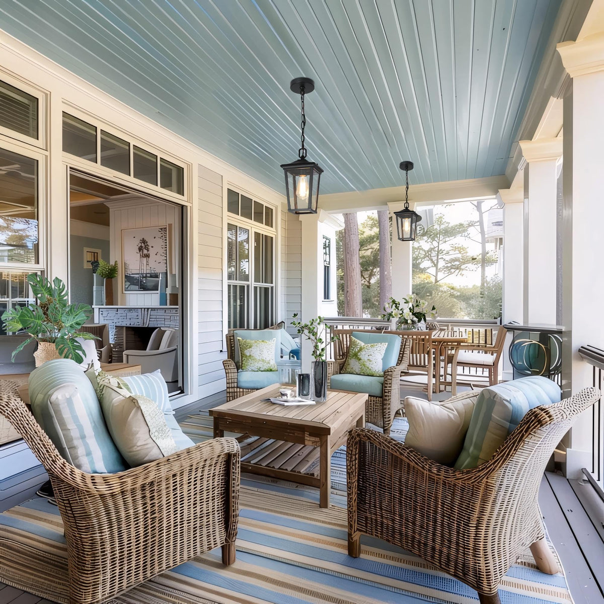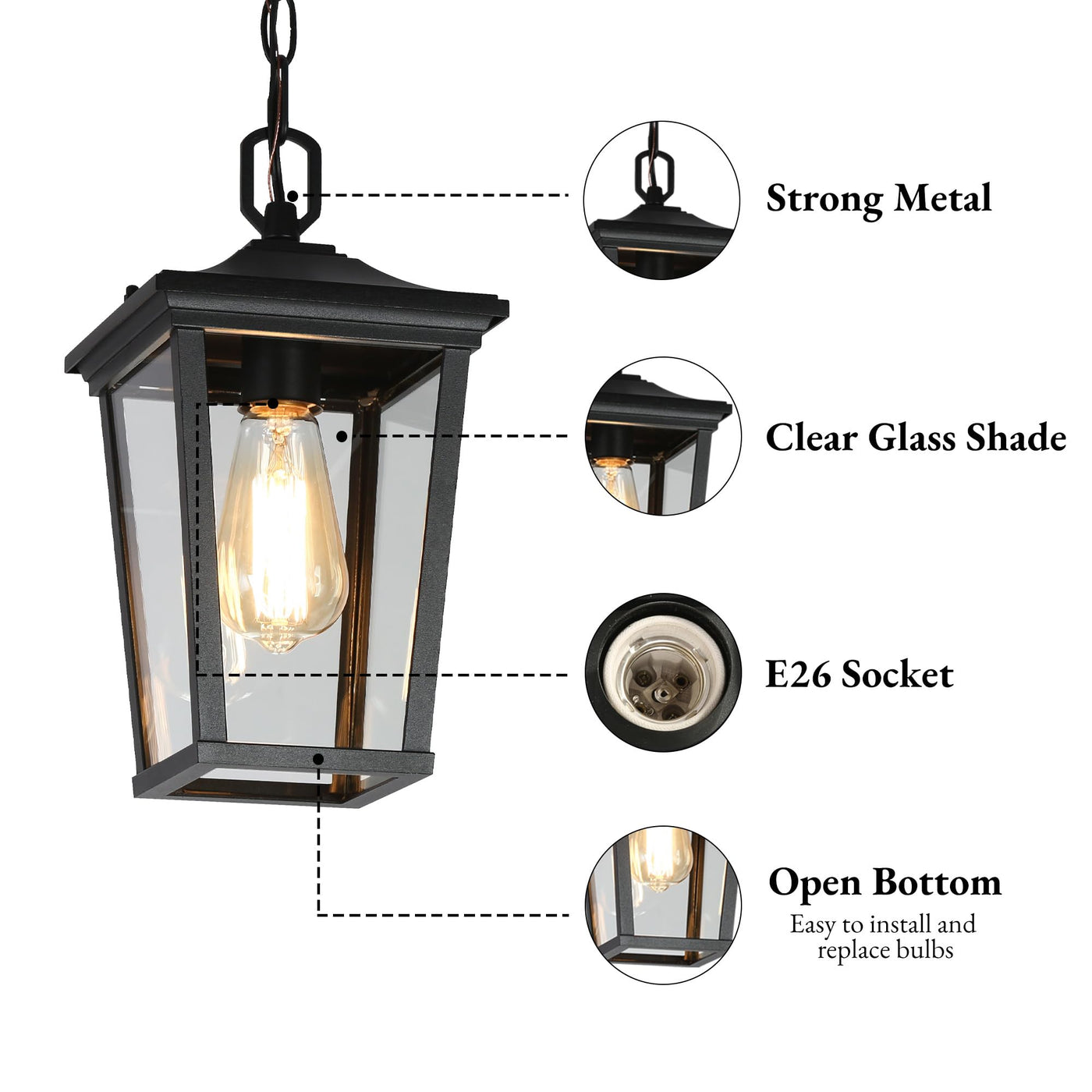 Q: Can the hanging height of the pendant light be adjusted?A: Yes, the outdoor pendant light comes with a 59-inch adjustable hanging chain, allowing you to customize the hanging height from a minimum of 15 inches to a maximum of 74.5 inches, making it ideal for various ceiling types.