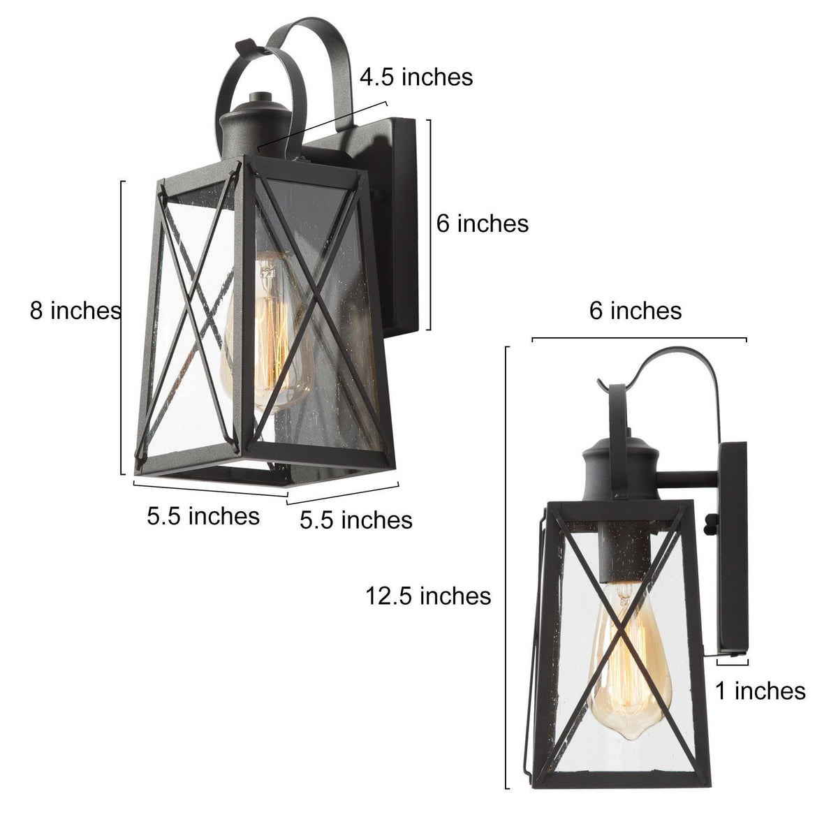 Q: What are the dimensions of the Outdoor Wall Lights?A: The overall height of the exterior wall lanterns is 12.5 inches, with a width of 6 inches and an extended length from the wall of 6 inches. The backplate measures 4.5 inches by 6 inches and is 1 inch thick.