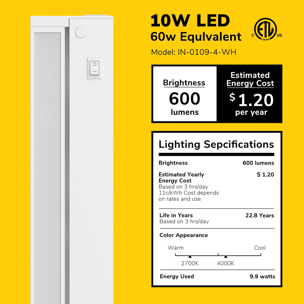 Getinlight Slim Swivel Led Under Counter Lighting Features A Center Swivel Section For Directional Light Control, Hides Perfectly Under Cabinet With Its Slim Design. You Can Link Multiple Fixtures (Up To 200 Watts Total) To Customize Your Lighting Needs Construction Made Of Aluminum And Polymeric Material Built-In Driver, No Transformer Or Adapter Required Integrated Led Chips, No Need To Replace On/Off Switch Electrical Produces 550 Lumens Of Warm White (2700K) Or Bright White (4000K) Light While Only Using 10-Watt Of Electricity Utilizes High Performing Leds With Greater Than 80 Cri Lifetime Rated For Greater Than 30,000 Hours Optical System Polycarbonate Diffuser Finish Exterior White Powder Coat Finish Installations 1. Plug-In2. Hardwire (Junction Box In-0501-3 Required, Sold Separately)Optional Linking Cord Available In 24 (Jc2-24-Wh), 32 (Jc2-32-Wh), 60 (Jc2-60-Wh) Listing Cetlus Listed For Dry Location This Kit Includes (1) Led Under Cabinet Lighting Fixture (1) Cord And Plug (1) 6 Linking Cord (2) Wood Screws (1) Installation Instructions Warranty 3-Year Limited System Warranty Standard We Guarantee The Quality Of All Getinlight Products. If This Product Does Not Perform Properly, Please Contact Us.