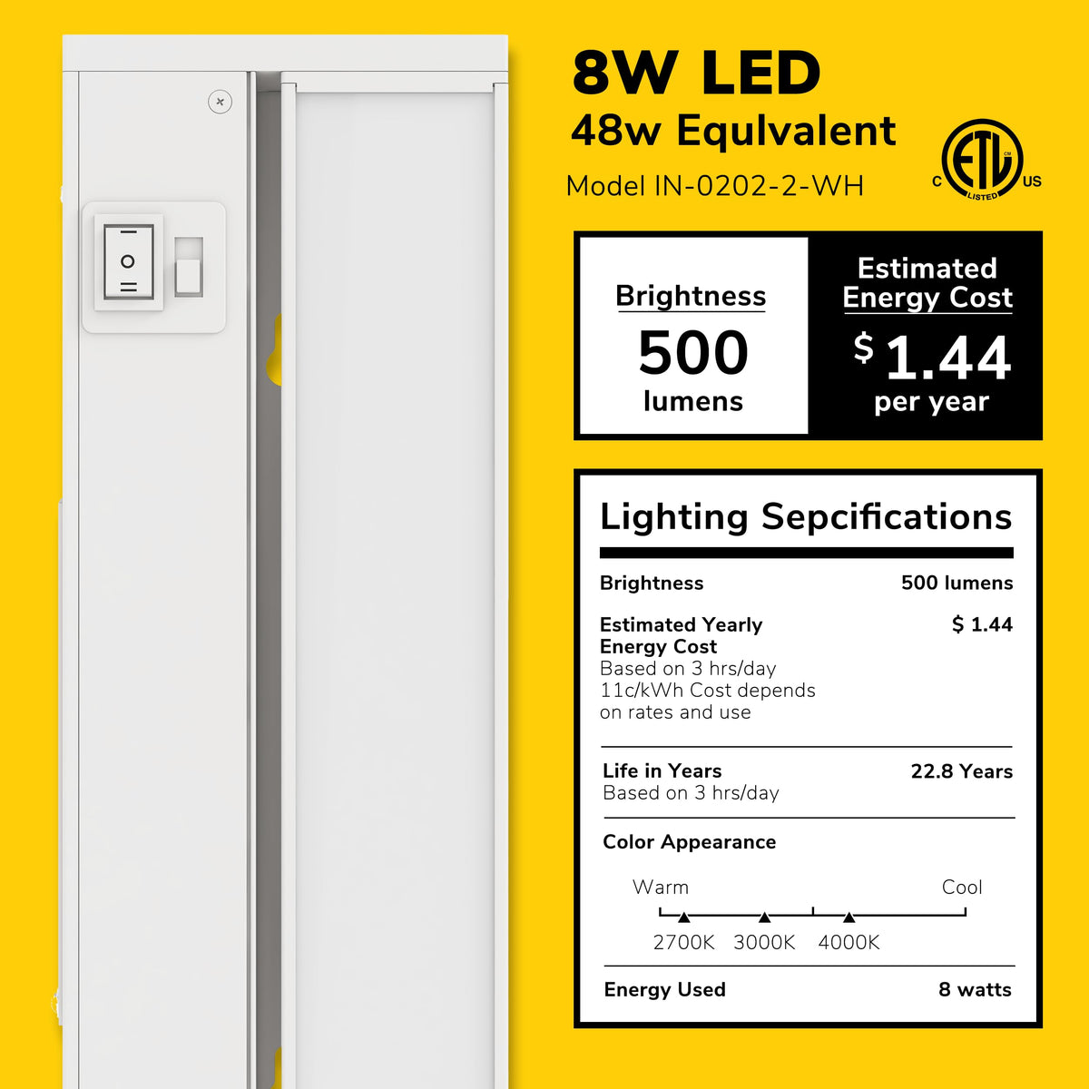 Getinlight In-0202 Series Under Cabinet Lighting Fixture Features A Temperature Slide Switch Allowing Selection Among 3 Color Levels: Warm White (2700K), Soft White (3000K) & Bright White (4000K). Its Swivel Feature Makes The Positioning Of Fixture Under The Cabinet No Longer A Struggle. And The Enhanced Diffuser Ensures Zero Hot Spots On The Countertop! The Long-Lasting Lifespan Helps Save You The Trouble Of Going Through Constant Replacements, In Comparison To Traditional Light Bulbs. This Series Offers Perfect Color Accuracy With A 90 Color Rendering Index. Linkable Up To 20 Units For Different Lighting Plans.Construction1.25 Housing Made Of Extruded Aluminumknockouts Spaced Every 4 On Top And Back For Maximum Wiring Flexibilitybuilt-In Driver, No Transformer Or Adapter Requiredintegrated Led Chips, No Need To Replace3-Position Switch Offers Different Brightness Level: Full, 50% Or Offelectrical440 Lumens Output With 8-Watt Of Electricity50,000 Hours Lifespanoptical Systemtempered Glass Diffuser, Even Light Distributionfinishexterior White Powder Coat Finishinstallationsplug-In Or Hard Wire Availableoptional Junction Box (In-0501-2) Is Available To Create A Paddle-Switchoptional Linking Cords Available In 12 (Jc1-12-Wh), 24 (Jc1-24-Wh), 32 (Jc1-32-Wh) And 60 (Jc1-60-Wh) Listingcetlus Listed For Dry Locationthis Kit Includes(1) Led Under Cabinet Lighting Fixture(1) 6 Ft. Cord And Plug(1) 6 In. Linking Cord(1) End-To-End Connector(1) Romex Connector(2) Wood Screws(1) Installation Instructionswarranty5-Year Limited System Warranty Standardwe Guarantee The Quality Of All Getinlight Products. If This Product Does Not Perform Properly, Please Contact Us.