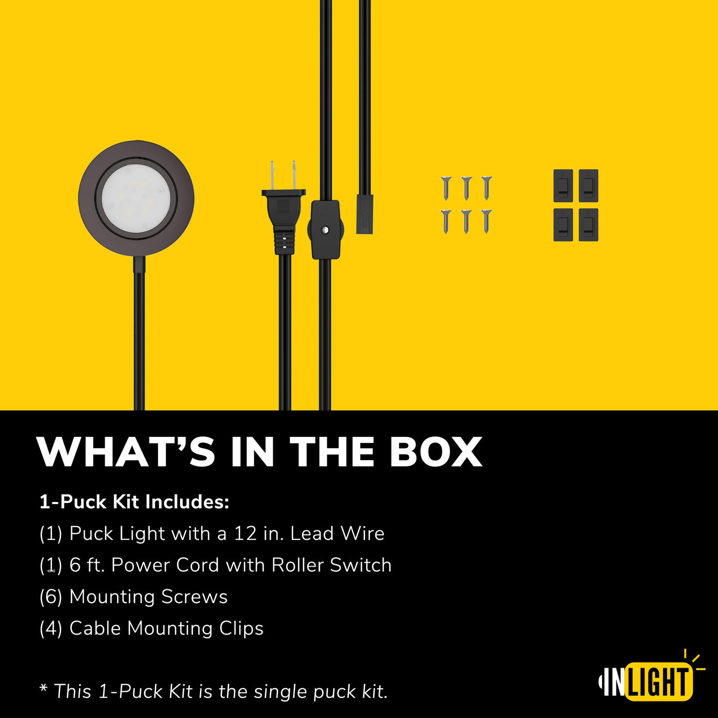 1-Puck Kit Includes (1) puck with a 12-inch lead wire (1) 6 ft. power cord and mounting screws