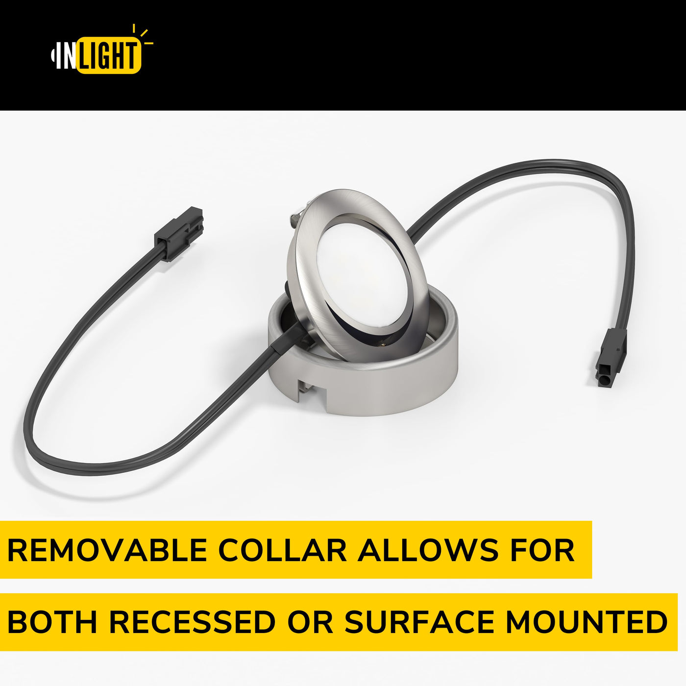Q: What materials are used in the construction of these puck lights?A: The puck lights feature a durable zinc alloy trim with a steel collar and a brushed nickel finish, ensuring both aesthetic appeal and longevity. They also include a white polycarbonate diffuser that provides uniform light distribution.