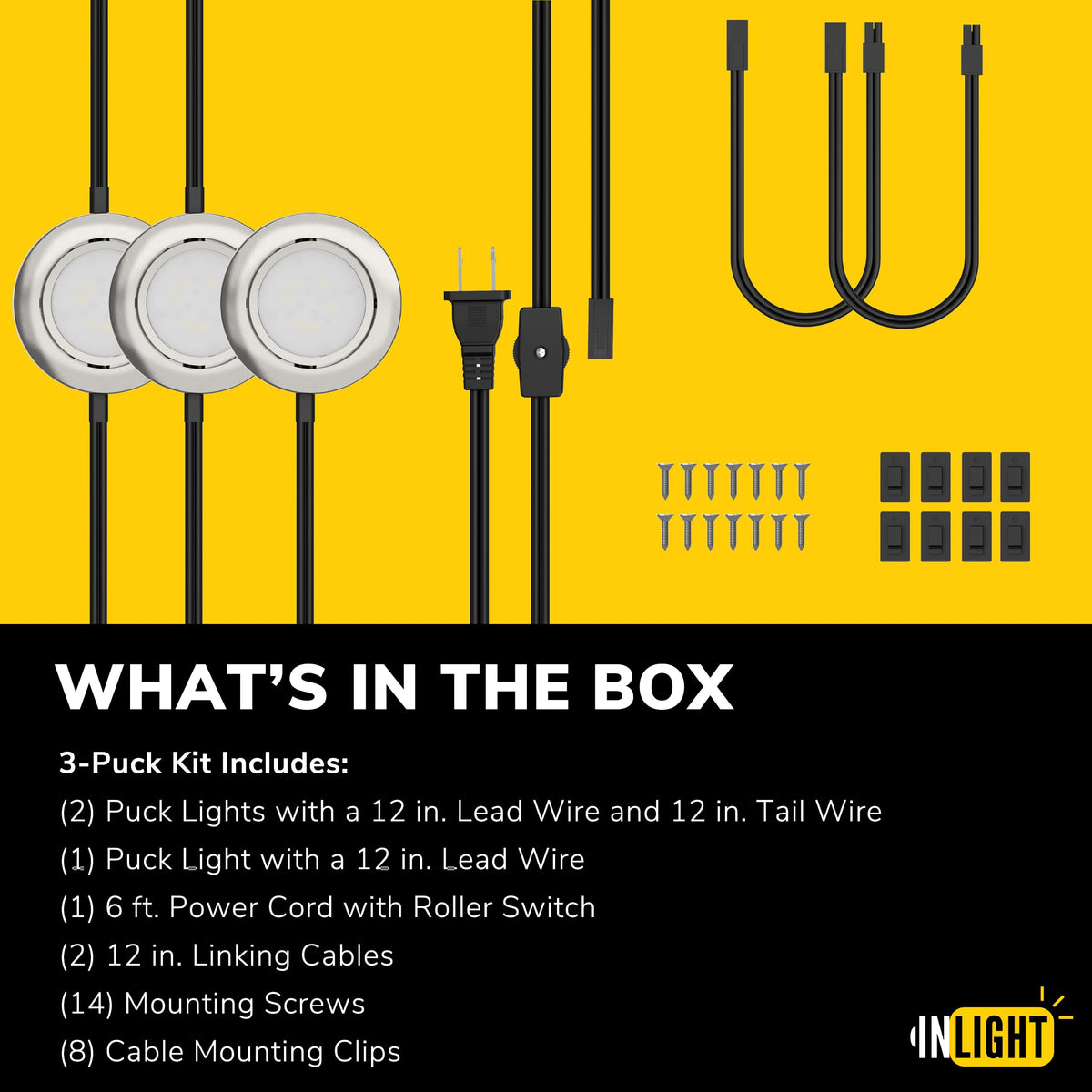 3-Puck Kit Includes (2) pucks with a 12-inch lead wire and 12-inch tail wire (1) puck with a 12-inch lead wire (2) 18" linking cables (1) 6 ft. power cord and mounting screws