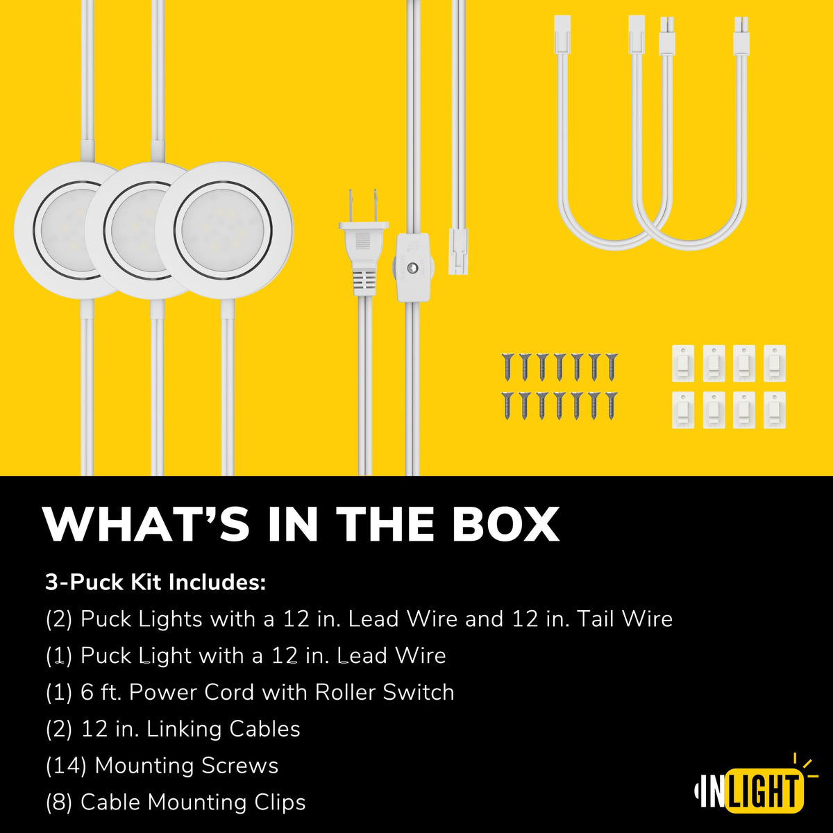 3-Puck Kit Includes (2) pucks with a 12-inch lead wire and 12-inch tail wire (1) puck with a 12-inch lead wire (2) 18" linking cables (1) 6 ft. power cord and mounting screws