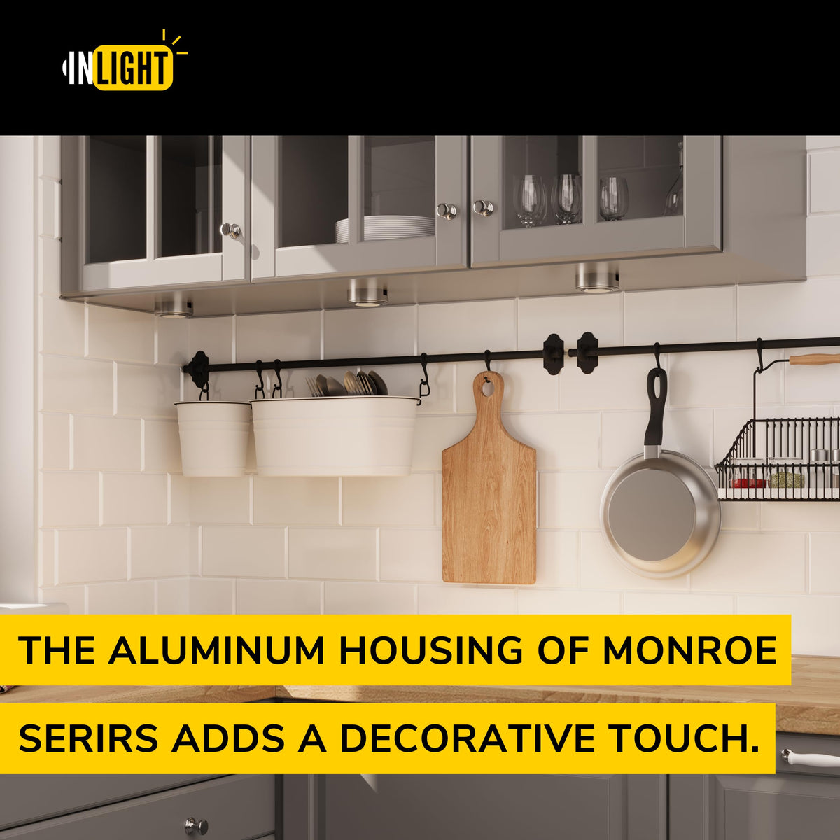 GetInLight line voltage, high performing, easy to install puck lights with swivel feature offer over 200 lumens per puck without the need for a driver. Works great for under cabinets, display cases, retail, entertainment centers, bar areas, wine rooms, built-in shelving and more.