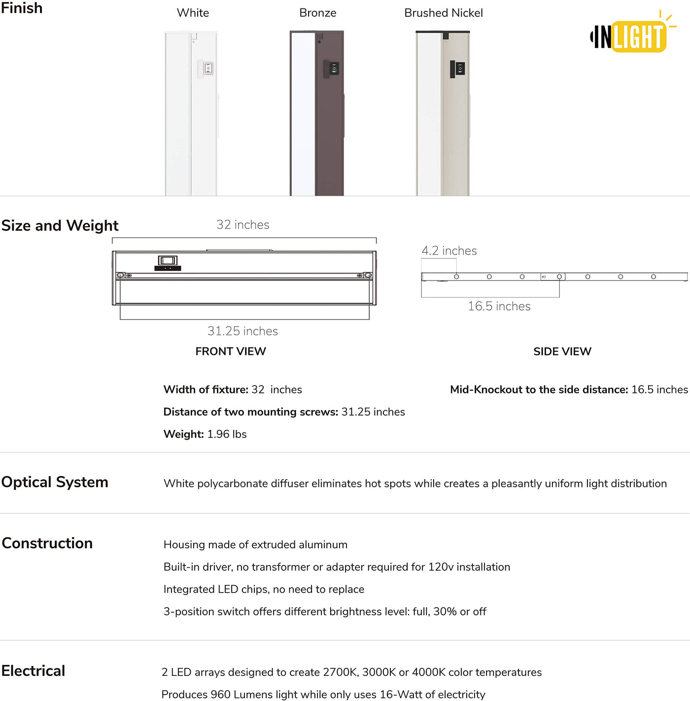 Getinlight In-0210 Series Under Cabinet Lighting Fixture With Low Profile Design And Aluminum Housing. Features A Temperature Slide Switch Allowing Selection Among 3 Color Levels: Warm White (2700K), Soft White (3000K) & Bright White (4000K). Rated Lifespan 50,000 Hrs. 90 Cri. Dimmable Using A Standard Dimmer. Linkable Up To 20 Units. Plug-In Installations: Attached To The Cabinet With 2 Captive Mounting Screws, And Wire The Power Cord (Included) To Main Supply.Optional Power Cord Available In 3 Ft. (Pc1-36-Wh) Hardwire Installations: This Fixture Can Be Direct Wired (All Accessories Included), Knockouts Spaced Every 4'' On Top And Back Offer Maximum Wiring Flexibility. This Kit Includes: 3 Color Led Undercabinet Fixture6' Cord And Plug6'' Connecting Cablehardwire Connection Kit. Certificationapproved By Etl Standards For Canada And Usa. Quality Guaranteewe Guarantee The Quality Of All Getinlight Products. If This Product Does Not Perform Properly, Please Contact Us.