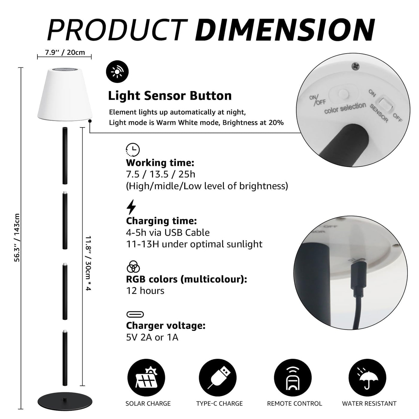 Solar Charging and USB Charging: Outdoor LED floor lamp eliminates cumbersome cables and does not require a power outlet. Outdoor floor lamps with 2-in-1 solar charging and USB charging can last for 5-6 hours on a single charge or be fully charged with solar energy for 6-8 hours of 100% white light and 15-20 hours of RGB lighting. Adjustable Height Floor Lamp: The outdoor floor lamp consists of 4 aluminum poles, 1 lamp head, and 1 sturdy metal base. The 4 poles are detachable, allowing you to adjust the height of the lamp according to your preference. Illuminate your life with your own DIY height. Outdoor Solar Floor Lamp Assembly Instructions: I. Screw the lamp pole onto the socket pole; II. Screw the two poles together; III. Screw the two lower poles together; IV. Screw the lamp shape onto the socket pole. Outdoor Dimmable Floor Lamp: LED floor lamp with 8 colors, warm white (100% and 20% brightness) and RGB LED colors, 2 dynamic modes (smooth transition mode or monochrome mode). The pull cord switch design allows for convenient turning on and off of the light. For outdoor use, on the patio, in the garden, by the pool, or on the balcony. The sturdy metal base and poles ensure the stability of the floor lamp. Suitable for indoor and outdoor use.