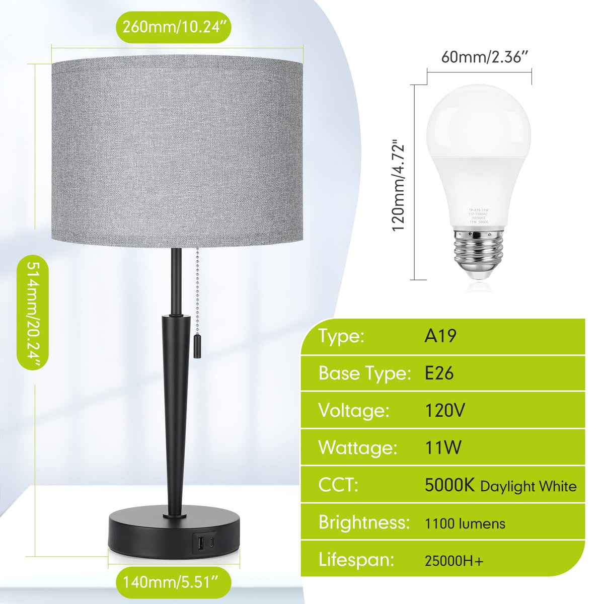 Set Of Two Big Bedside Lamps With Usb C Charging Ports Why Choose Ggoying Table Lamp? We Are More Professional, For We Only Do One Thing Focused On The Creation Of Table Lamps. We Carefully Cherish Every Lamp And Are Willing Our Table Lamp Can Bring More Warmth And Brightness To Every Home. Are You Still Looking For One Ideal Table Lamp? 1. Built With Dual Upgraded 5V/ 2.1A Usb C And Usb A Charging Ports, Provide More Convenience For You To Charge Your Devices, Such As Phones, Ipad, Kindles, Headsets, Diffusers, Speakers, Or Other Electronics. 2. Especially Equipped With 5000K A19 Led Bulbs, Show The Lamp'S Beauty And Classic More Completely. 3. Smooth Pull Chain Switch Is Easy For You To Control. 4. Ideal Size Is Very Compatible With Any Place You Want To Place. 5. Superior Material And Exquisite Manufacture Make The Lamp More Advanced And Durable. Bulb Parameters: Type: A19 Wattage: 11W Voltage: 120V Cct: 5000K Lumens: 1100Lumens Package Include: 2 X Table Lamp 2 X Lampshade 4 X Metal Ring 2 X Led Bulbs 1 X User Manual