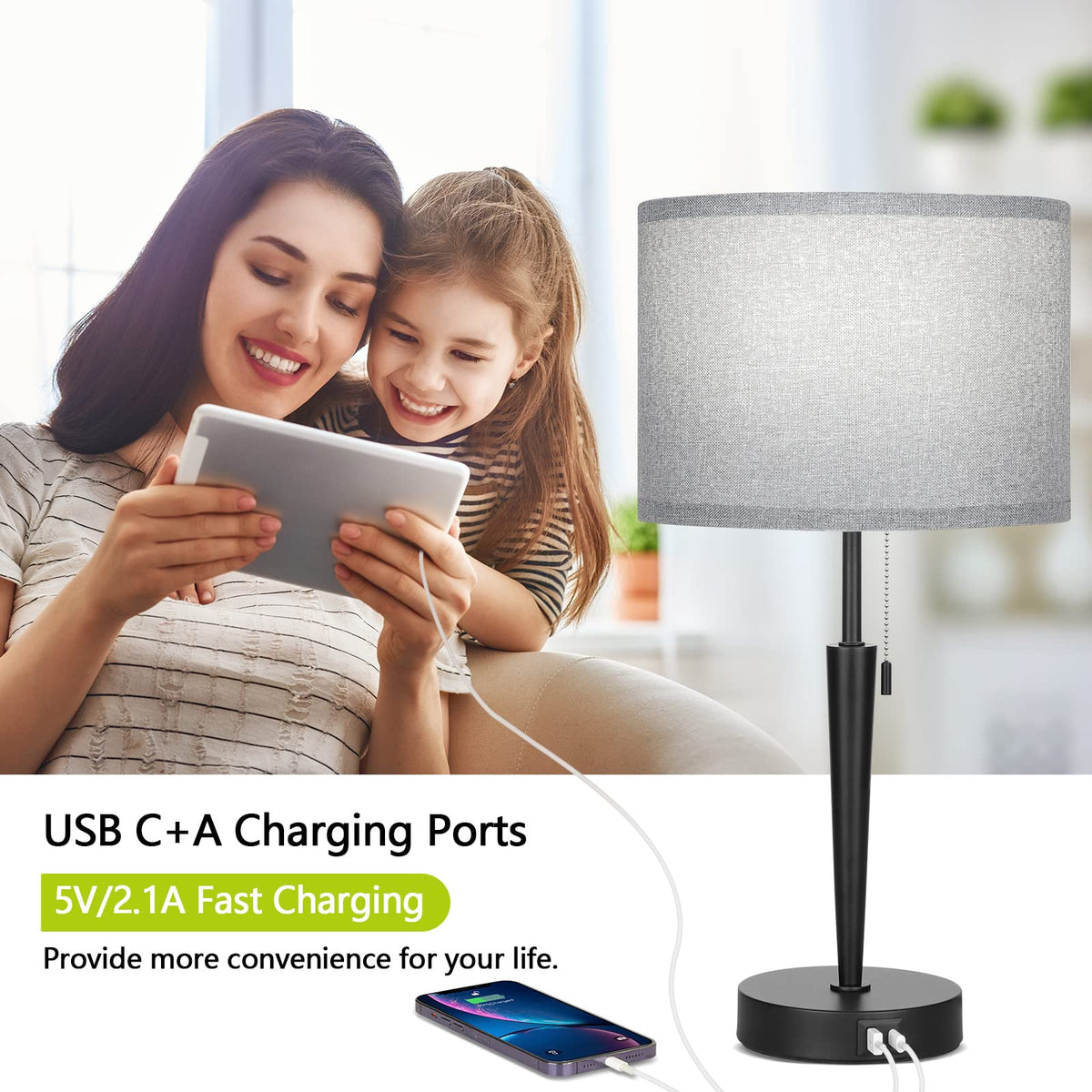 Ggoying Set Of 2 Bedside Lamp, Pull Chain Big Table Lamps With Usb C+A Charging Ports,5000K Led Bulbs,Grey Lampshade For Livingr