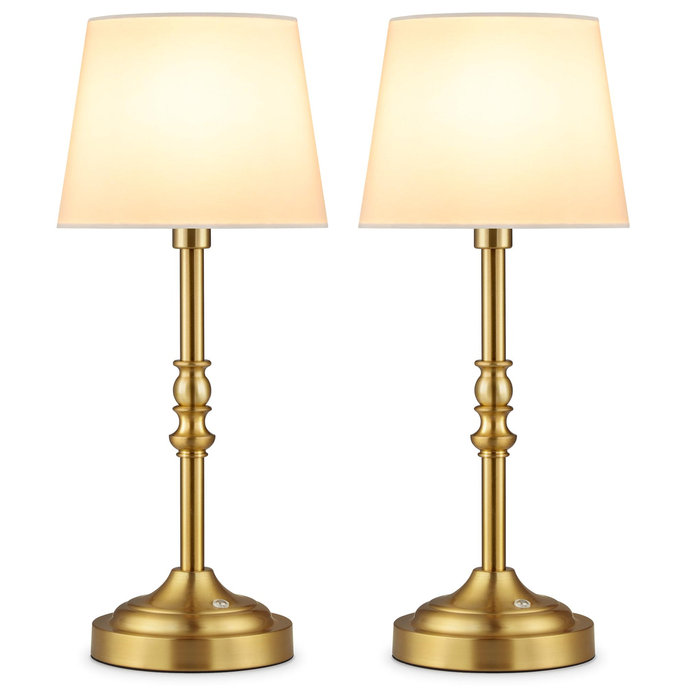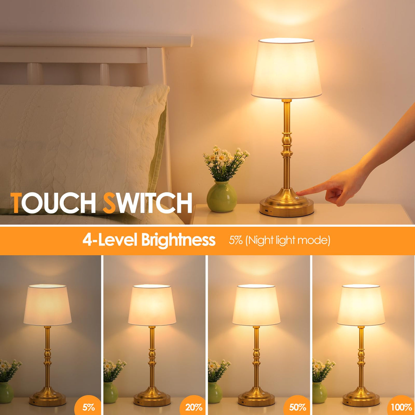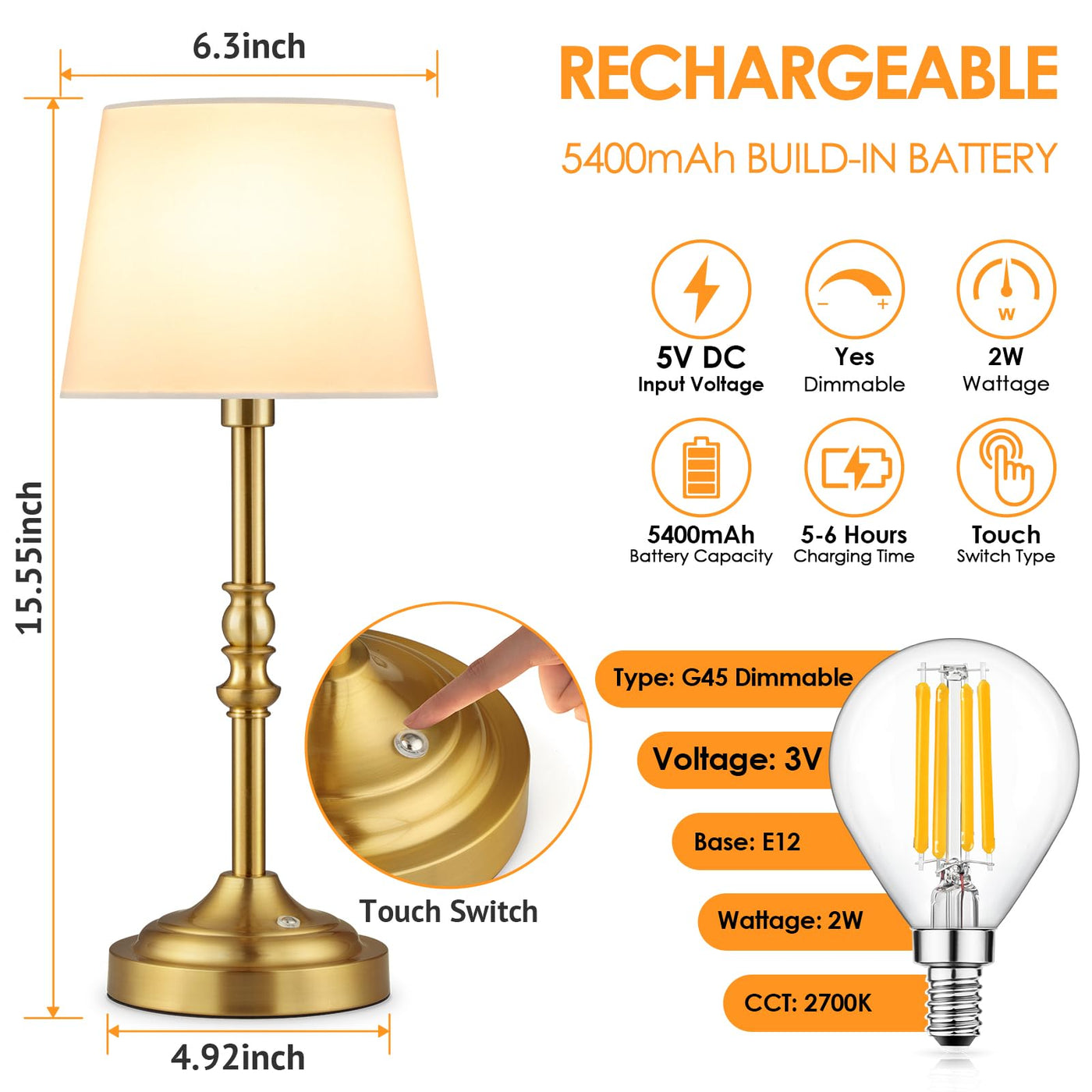 GGOYING Set of 2 Rechargeable Cordless LED Table Lamps, 4-Level Dimmer, Bronze Portable Desk Lamps with White Fabric Shades, Night Light for Dining, Bedroom and Patio < b > Set of 2 Portables Cordless Table Lamp< /b > < br >Why choose GGOYING table lamp?< p > < /P >1. Upgrade your lighting setup with this elegant two-pack wireless charging desk lamp, featuring a stunning gold body and a sleek white lampshade.< p > < /P >2. Each lamp is equipped with a 2700K G45 low-voltage bulb that emits a warm, cozy glow perfect for creating a relaxing atmosphere. < p > < /P >3. The lamps are dimmable with four adjustable brightness levels, allowing you to customize the light intensity to suit any mood or task, whether you 're reading, working, or unwinding.< p > < /P >4. Designed with modern convenience in mind, these lamps also feature a built-in wireless charging base, making it easy to charge your devices without cluttering your space with extra cables. < p > < /P >5. The compact and stylish design makes these lamps perfect for any room, from bedside tables to desks or living room spaces.< p > < /P >Enhance your home with the perfect blend of style, function, and technology in one compact package.< p > < /P >Technical Details:Voltage: 5VWattage: 2WBase Type: E12Power Source: Battery-poweredSwitch Type: Touch control switchUSB C Charging PortsDimmable: 4-Way Dimming