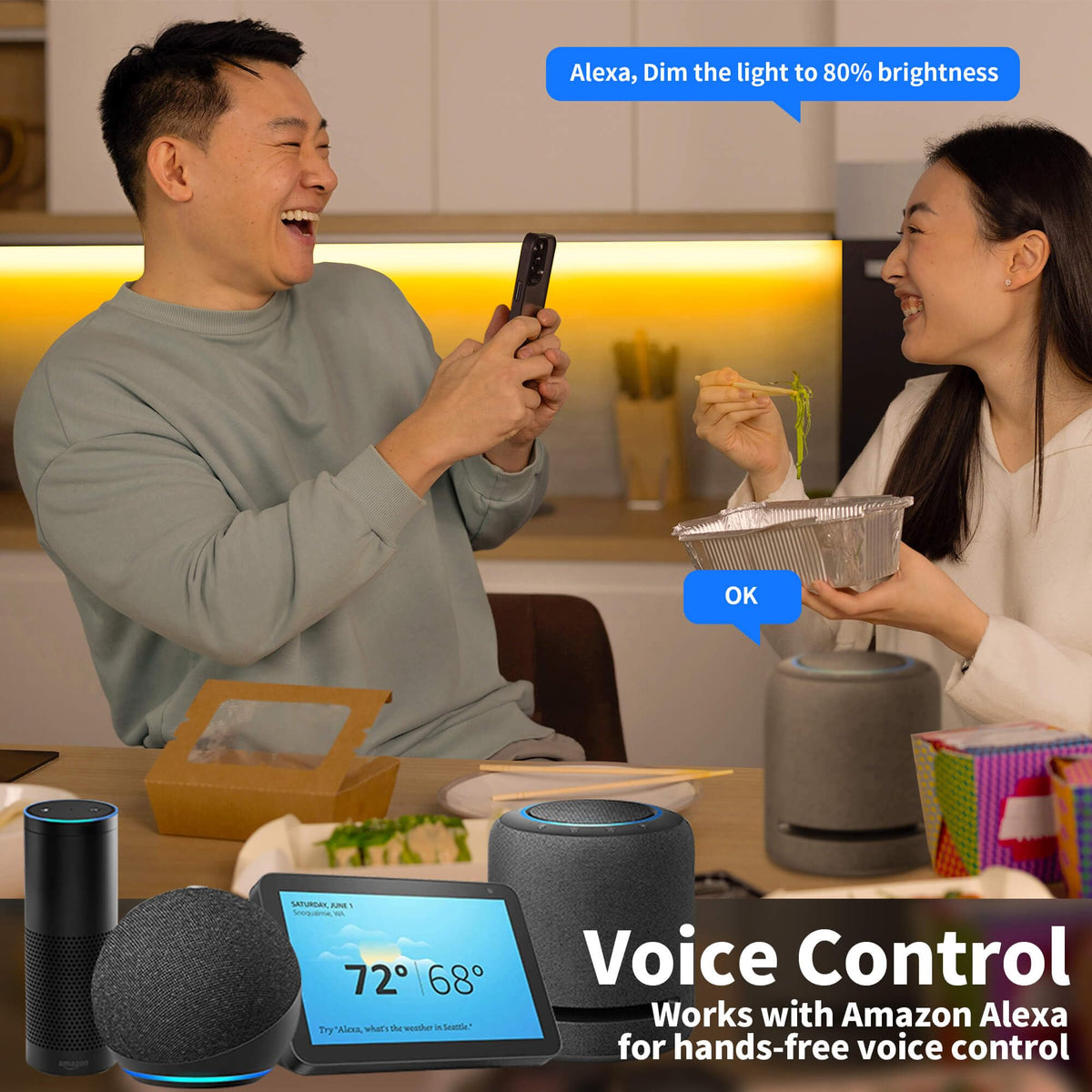 Q: Does the LED light strip work with voice assistants?A: Yes, the GIDERWEL LED light strip is compatible with Amazon Echo Plus for voice control functionality.