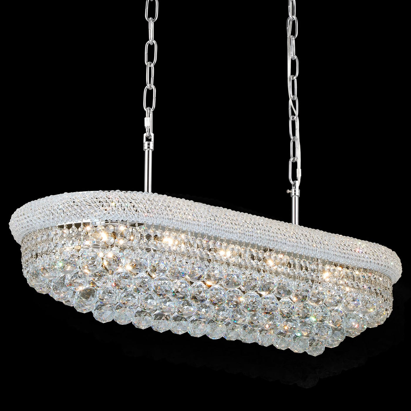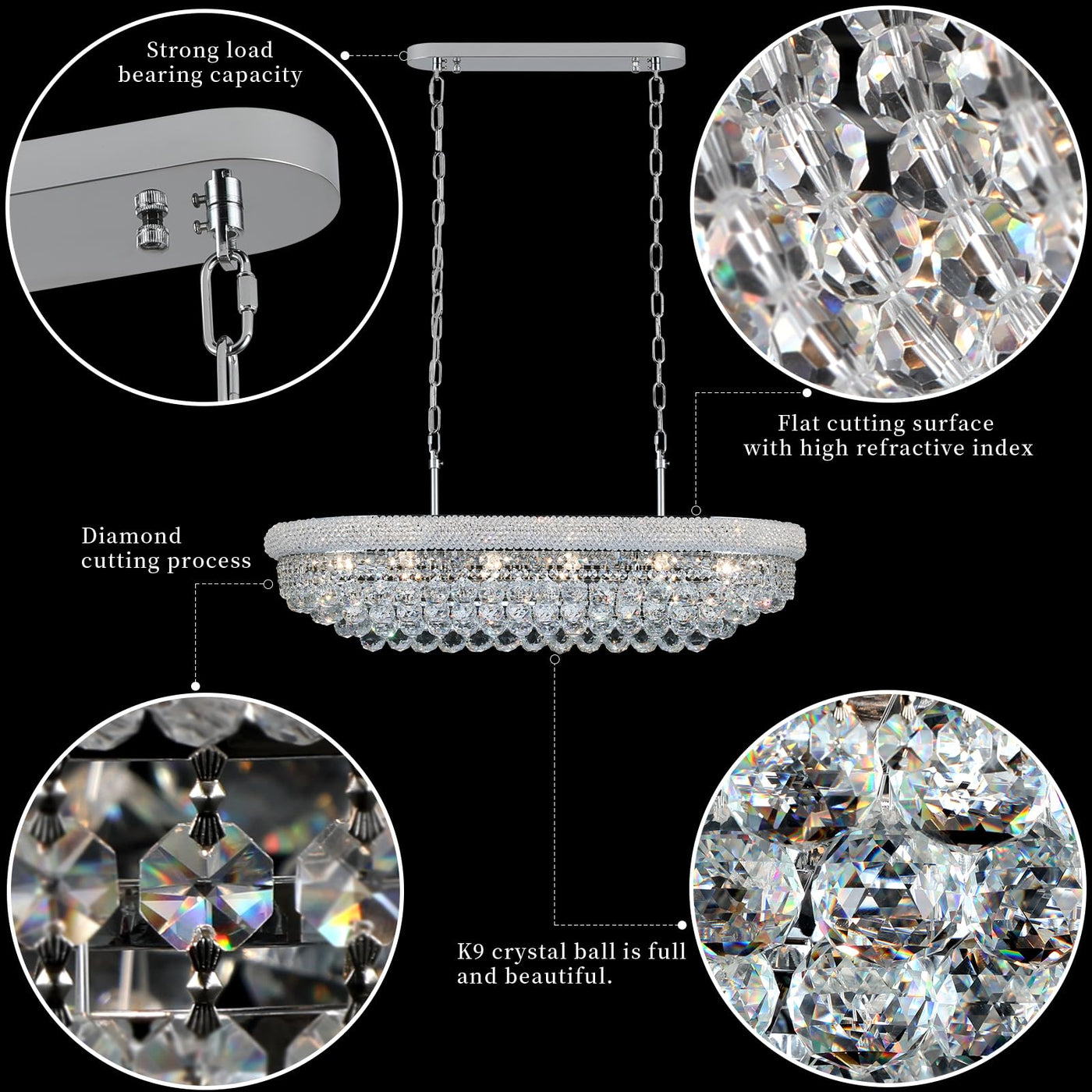 Empire Style Design:This Crystal Chandeliers For Dining Room Is Made Of K9 Crystals When You Turn On The Light ItS Like Opening A French Romantic Journey The Light Refracts A Dreamy Light Through The Crystals Creating A Noble And Charming Atmosphere Chandeliers Size:This Empire Crystal Chandeliers Has A Diameter Of 36 Inches The Whole Light Hangs At A Maximum Height Of 63 Inches A Minimum Of 18 Inches And Weighs 49 Pounds. We Have More Colors And Sizes To Choose Height Adjustable:The Package Of Dining Room Chandelier Includes Two 39.4 Inches Chandelier Chain You Can Adjust The Chain According To The Height You Need To Install It Is Very Convenient And Fits Your Ceiling Perfectly Dimmable:This stylish Crystal Chandeliers Requires 11*E12 Base Bulbs (40 Watts Maximum Power Per Bulb) If You Use Dimmable Bulbs And Dimmers This Kitchen Island Chandeliers Is Dimmable. (All Bulbs And Dimmers Are Not Included) Applicable Scene:This Chrome Crystal Chandeliers Combines stylish And French Empire Style The Recommended Use Area Is 200-300 Ft2 It Can Be Used As A Dining Room Light Fixtures Over Table And It Can Also Be Used In The Living Room Kitchen Island Bar Etc Installation:This Kitchen Island Light Fixtures Package Comes With Detailed Installation Instruction You Just Need To Follow The Installation Instructions In The Package To Assemble And Hang The Crystal The Installation Process Is Very Easy To Understand Customer Service:We Provide All Customers With Satisfactory Service If You Have Any Incomprehension About The Order Or Product Or Modern Crystal Chandeliers Installation And Other Problems We Will Provide You With Satisfactory Solutions With In 24 Hours