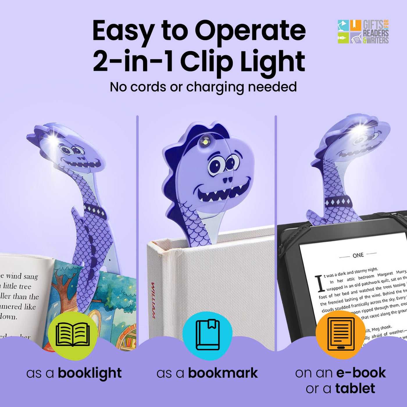 Gifts for Readers & Writers Bookmark Reading Light Dino Purple - 2in1 Clip On Bookmark Kids Book Light for Reading Night in Bed,