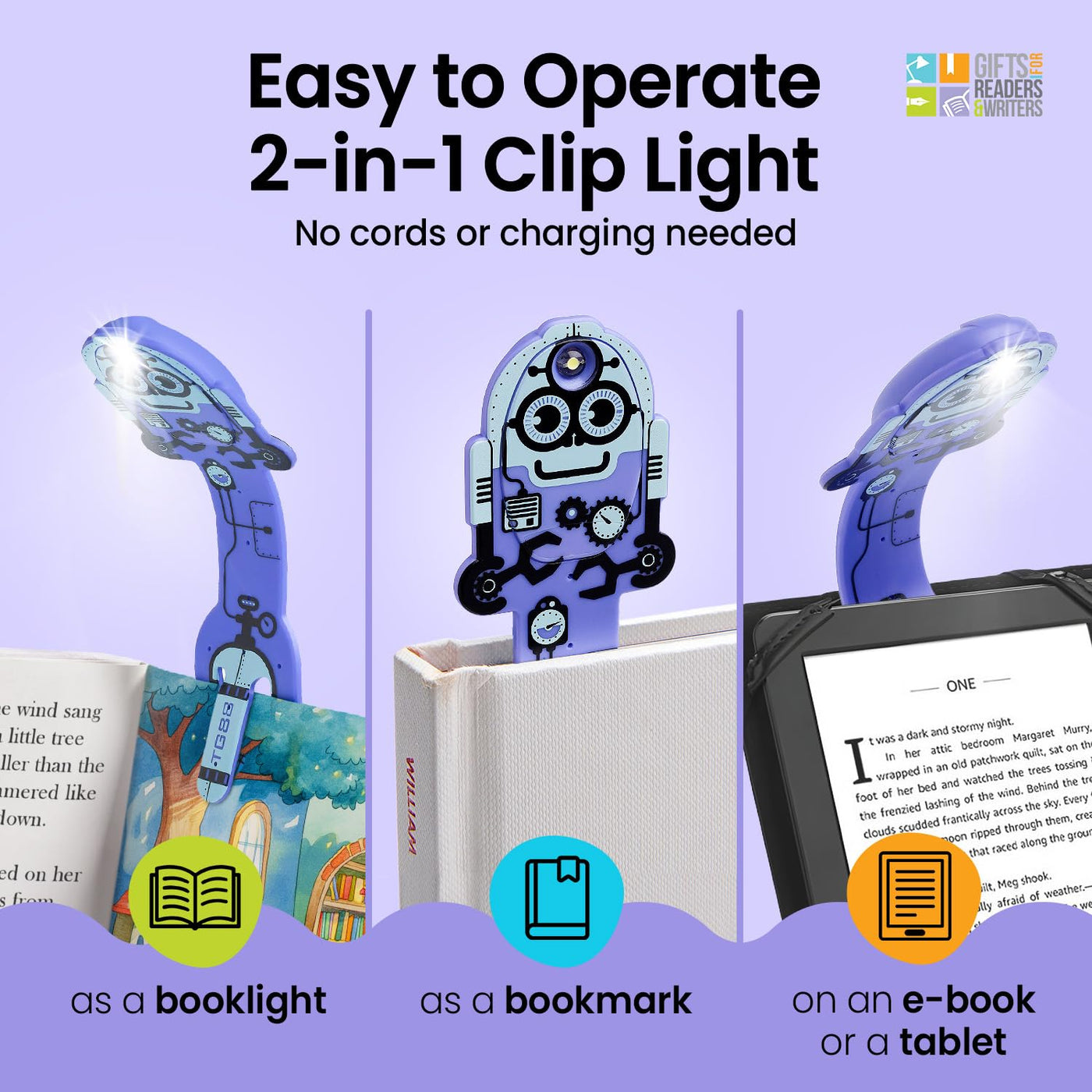 Gifts for Readers & Writers Bookmark Reading Light Robot Purple - 2in1 Clip On Bookmark Kids Book Light for Reading Night in Bed