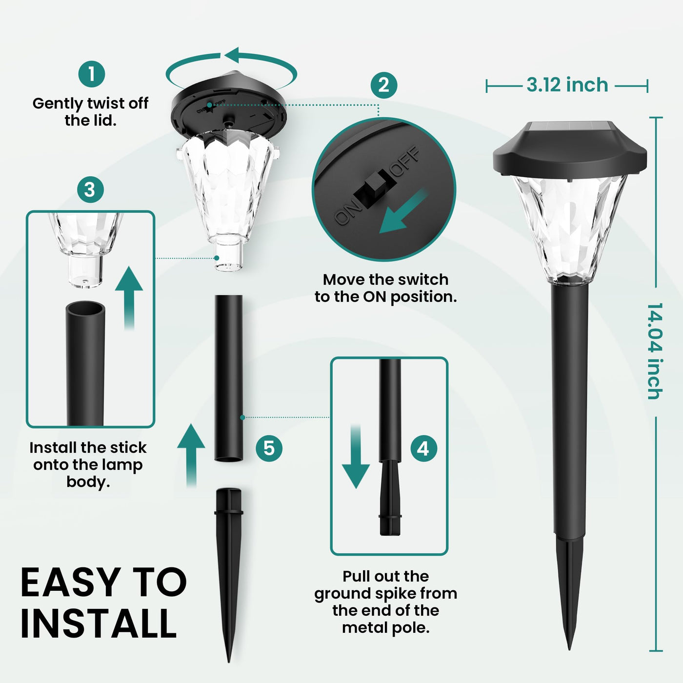 Q: What is the installation process for these solar lights?A: Installation is easy: simply remove the isolation tab under the cap, loosen the soil with a shovel, and push the stake into the ground where the lights will automatically turn on at night and off at dawn.