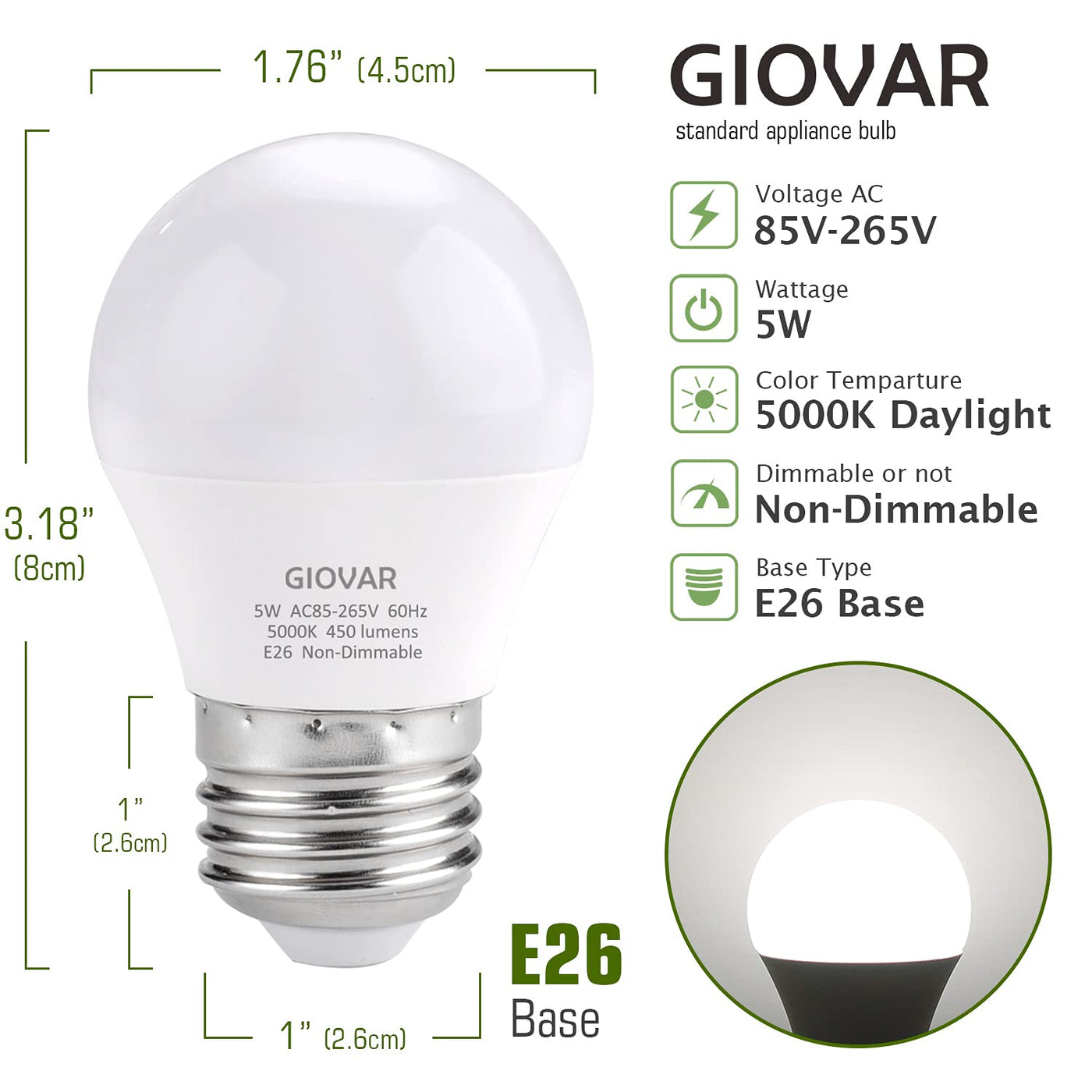 Giovar 2-Pack Led Refrigerator Light Bulbs 40 Watt Equivalent 120V, A15 Appliance Light Bulb Daylight 5000K For Fridge, E26 Base
