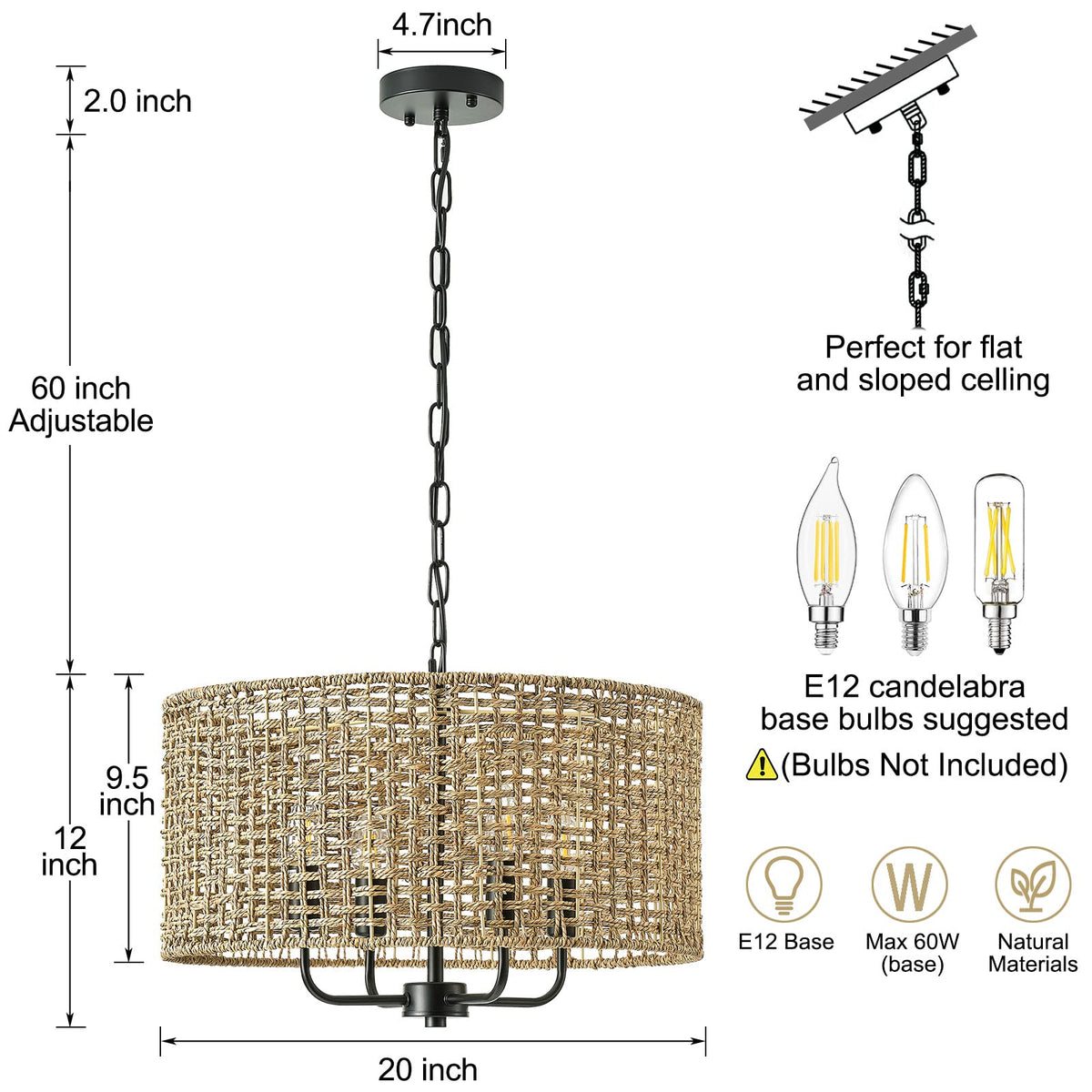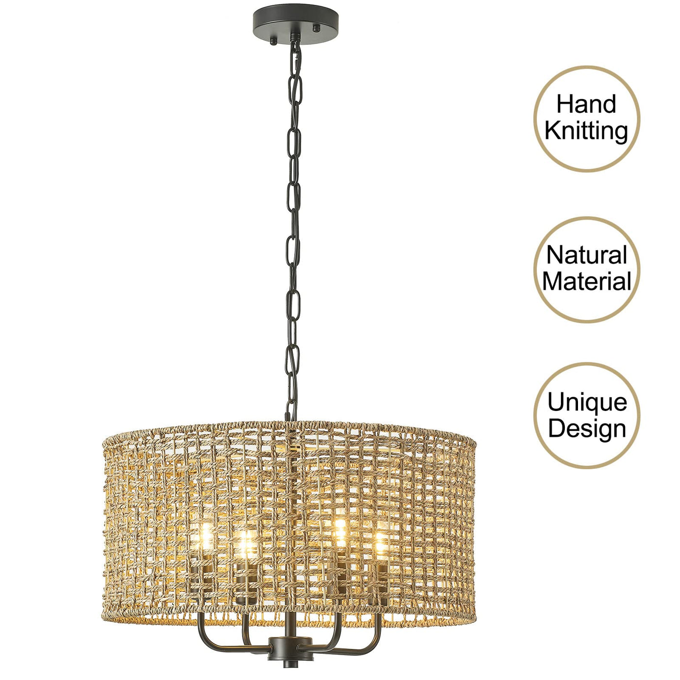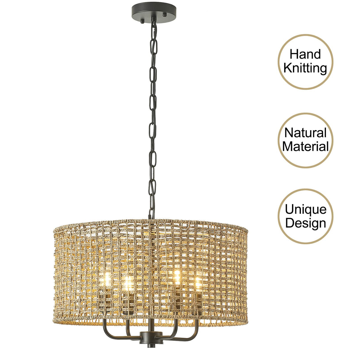 ?MODERN & FARMHOUSE STYLE CHANDELIER? This rattan chandelier is purely hand-woven crafted from natural rattan, adopts modern and rustic farmhouse styles, made of lampshade and the iron metal frame kit. When the ceiling light fixture is lit, casting a very beautiful and ray, create an elegant and romantic atmosphere for your room! | ?RATTAN DRUM-SHAPED DESIGN? This rattan pendant light, apply high-quality selected natural rattan material and open-air drum shade design, durable and long-lasting, protects the bulb, emits smooth light illuminate the whole space. | ?DIMENSION & ADJUSTABLE HEIGHT? Overall: 20'' diameter, 74'' height(maximum hanging length); Length of hanging chain: 60''. Weight: 7.5 pounds ( E12 bulb not included ), you can adjust the length to suit your ceiling height. Input Voltage: 110V-130V. | ?E12 BULBS LIGHT SOURCES & DIMMABLE? Our boho ceiling light requires 4 x E12 base bulbs ( Max 60W for each light, Bulbs Not Included ). Incandescent, CFL, halogen, LED bulbs suitable. It is fully dimmable when rattan ceiling light fixture used with dimmable bulbs and a suitable dimmer switch ( Bulb and Switch not included ). | ?WIDELY APPLICATIONS & EASY TO INSTALL? This large chandelier for ceilings is UL listed for indoor use, suit for multiple areas such as bedrooms, kitchens, living rooms, rooms, dining room, hallway. Suit for Coastal, Casual, Bohemian, Eclectic, Nautical, Rustic and Vintage style decor. All mounting hardware and instructions of ceiling light are included in package for installation. | ?AFTER-SALE SERVICE? Giutna provides 30-day return or exchange service. 8/24h friendly customer service. NOTE: vDue to natural maturation, the color of each color block may vary slightly.vPlease remember to disconnect the ceiling light power supply before installation.