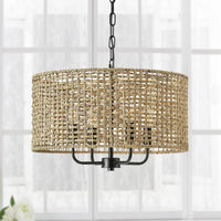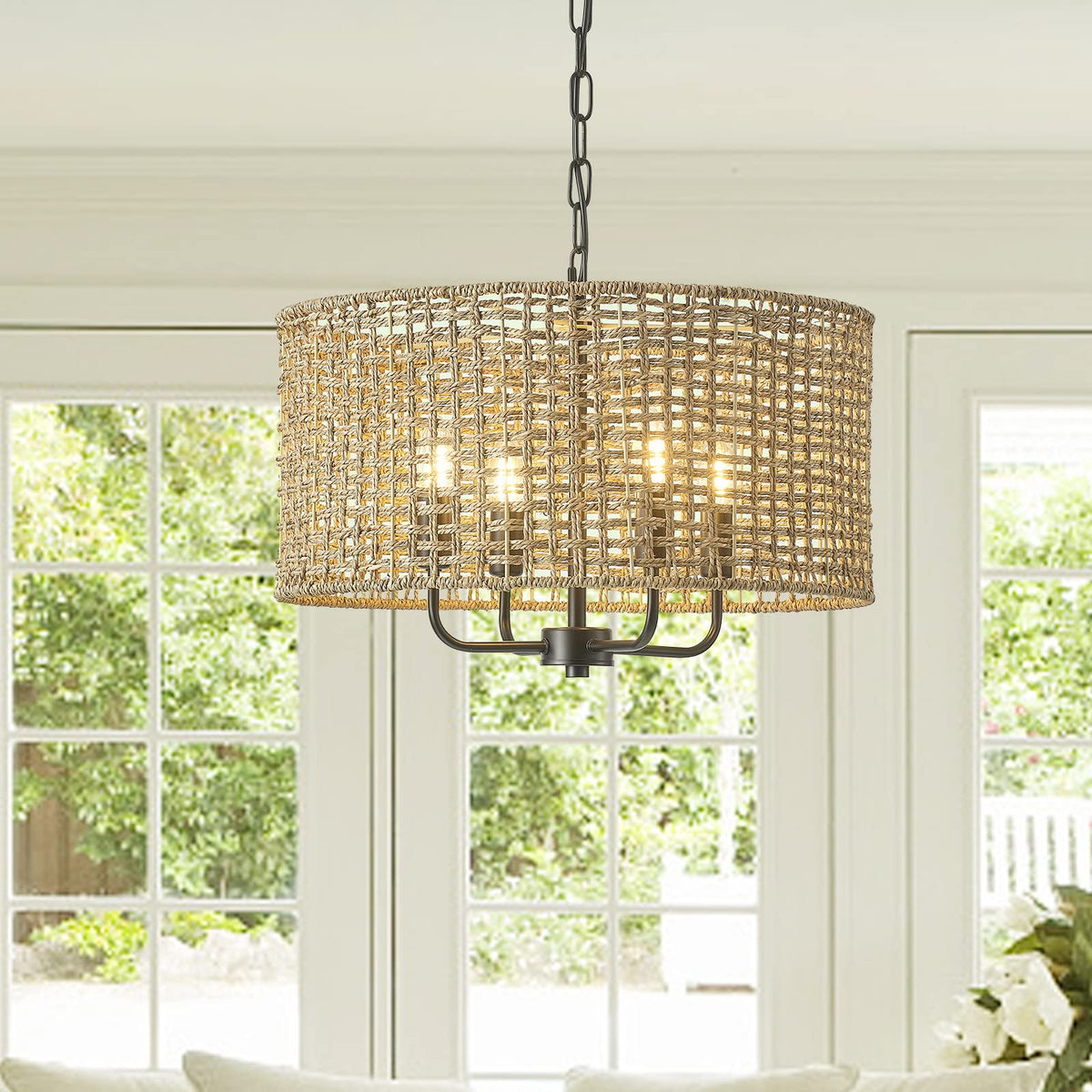 Giutna Rattan Wicker Drum Chandeliers For Dining Room, 4-Light Bohemian Hand-Woven Farmhouse Drum Pendant Chandelier Light Fixtu