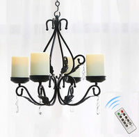 Q: How do the flameless candles work with the chandelier?A: The chandelier comes with 4 replaceable flameless candles powered by 2 CC batteries each (batteries not included). The candles can provide up to 800 hours of illumination and include a remote control with timer settings for 2, 4, 6, or 8 hours.