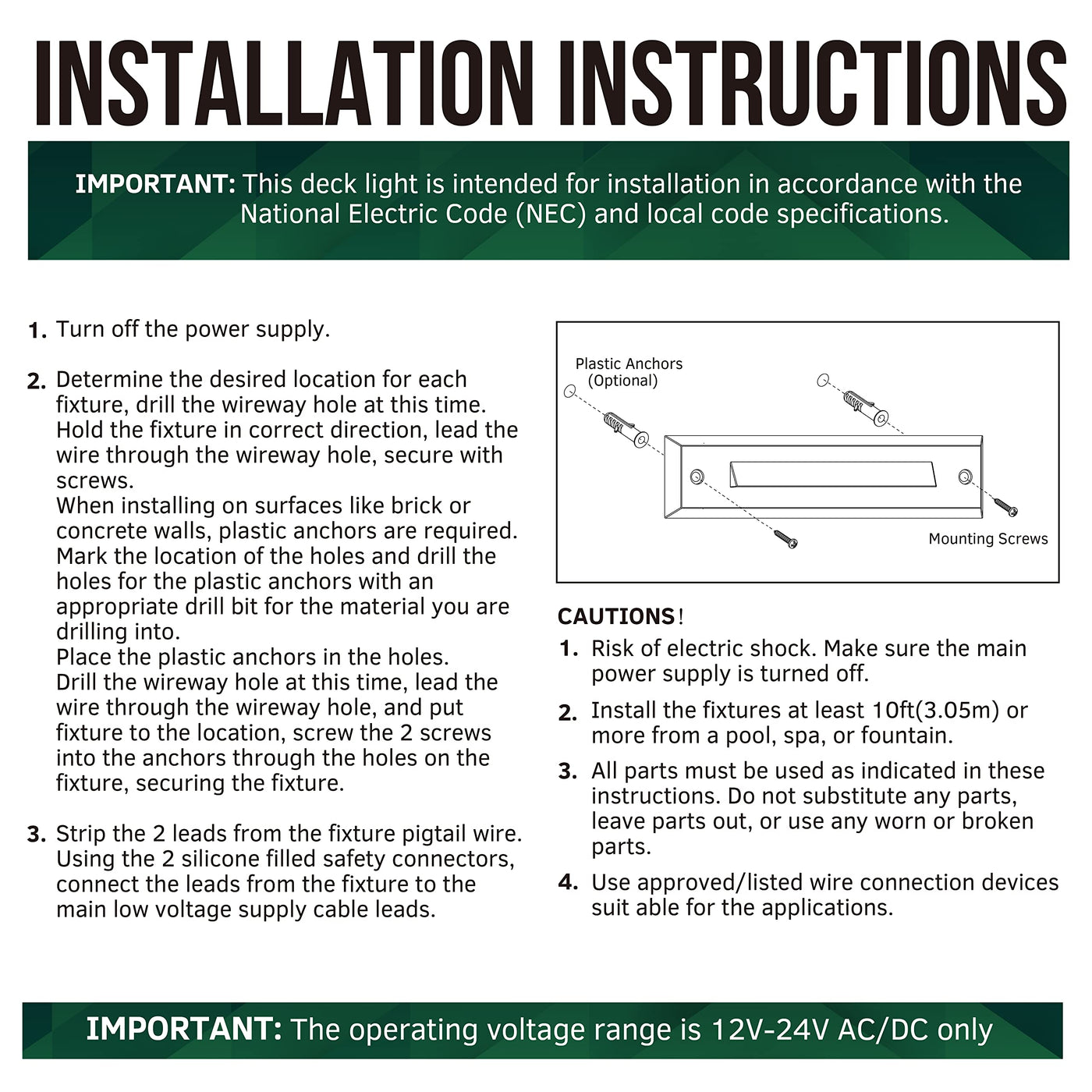 Product Introduction Illuminate your outdoor spaces with GKOLED low voltage LED deck lights, designed to provide a warm and soft light without any glare. Perfect for wet locations, these lights boast a rugged die-cast aluminum housing with a sleek black powder-coated finish, ensuring durability and longevity for outdoor use. Enjoy peace of mind with a 2-year warranty from the date of original purchase.