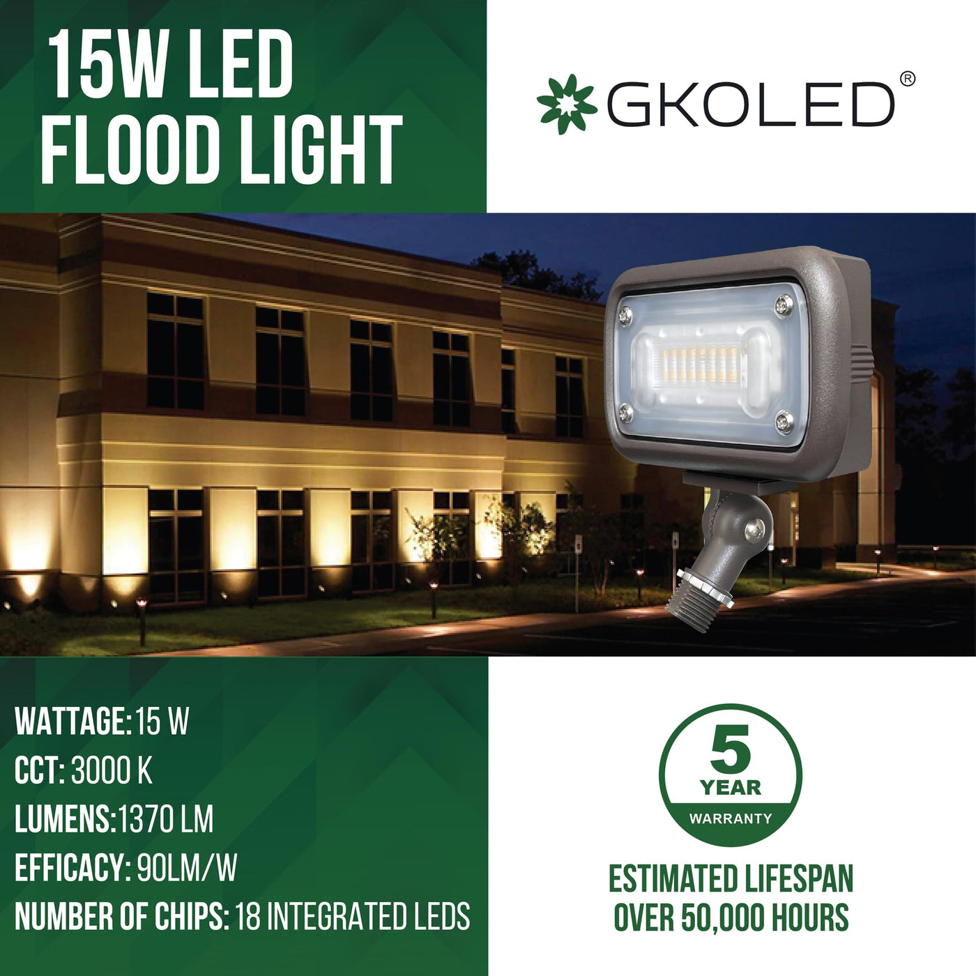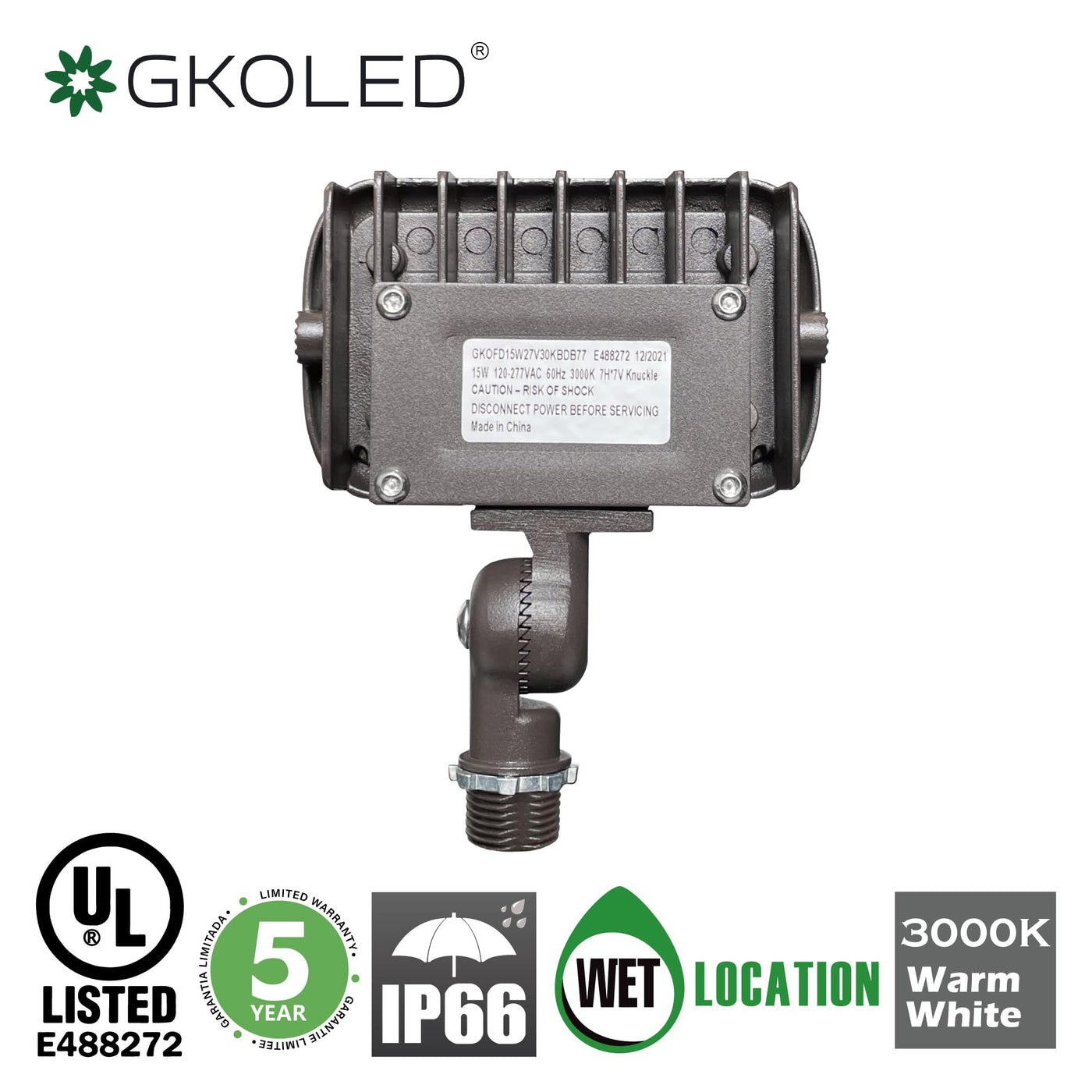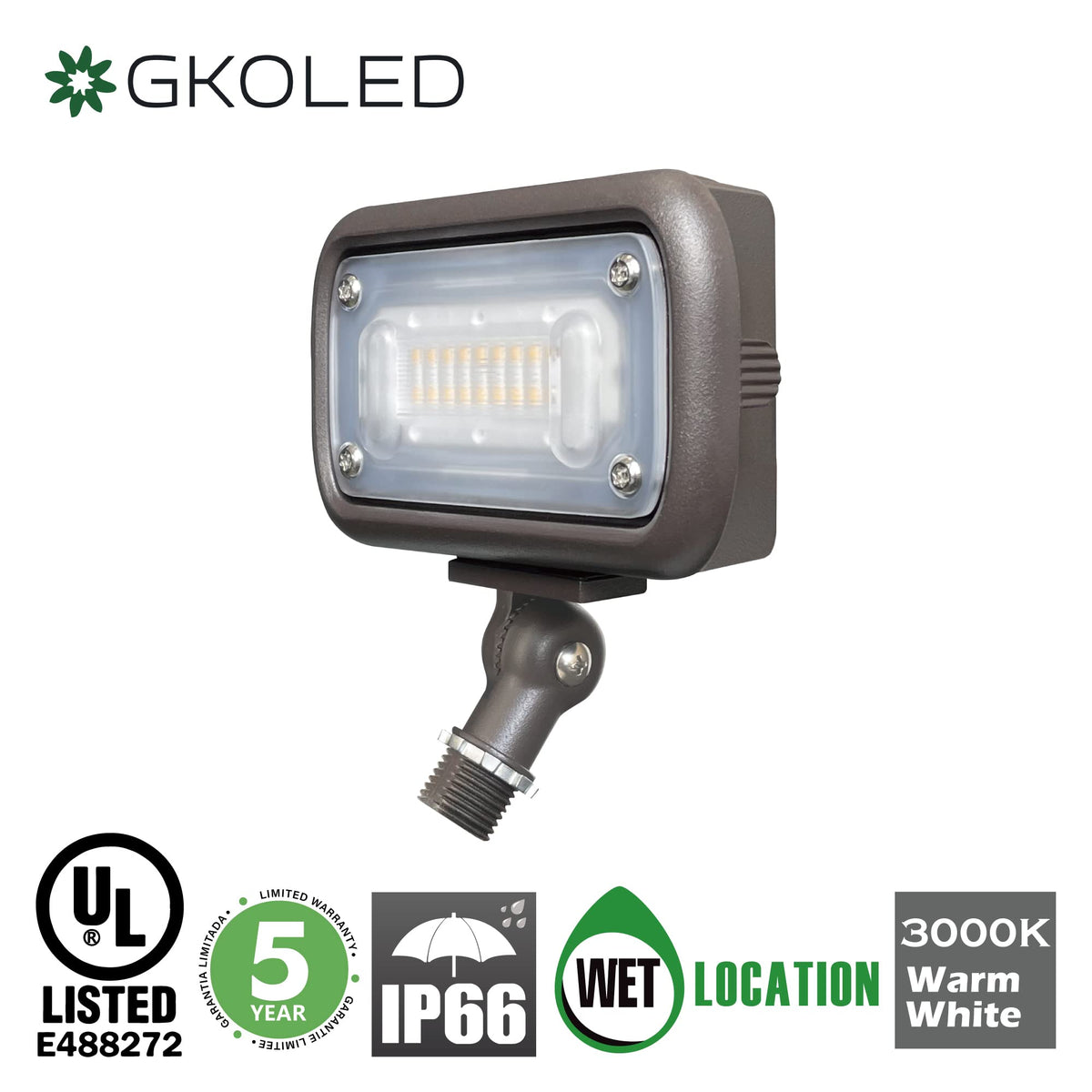 GKOLED 15W LED flood light emits a wide beam of 3000K(warm white) illumination for landscape lighting, parking lot lighting, tree uplighting, flagpole lighting, and architectural wall washing. The powerful LED fixture emits 1,370 lumens for ample outdoor illumination and operates within a wide 120-277 VAC range. The weatherproof LED fixture is constructed of heavy-duty die cast aluminum with an integral heat sink. This LED flood light is also equipped with a UL-Recognized constant-current driver. An adjustable mounting bracket allows you to direct illumination where it's needed. The LED fixture is designed to last 3 times longer than HID fixtures.