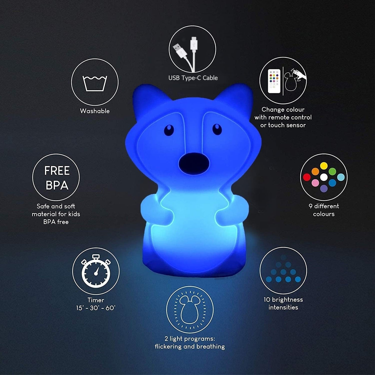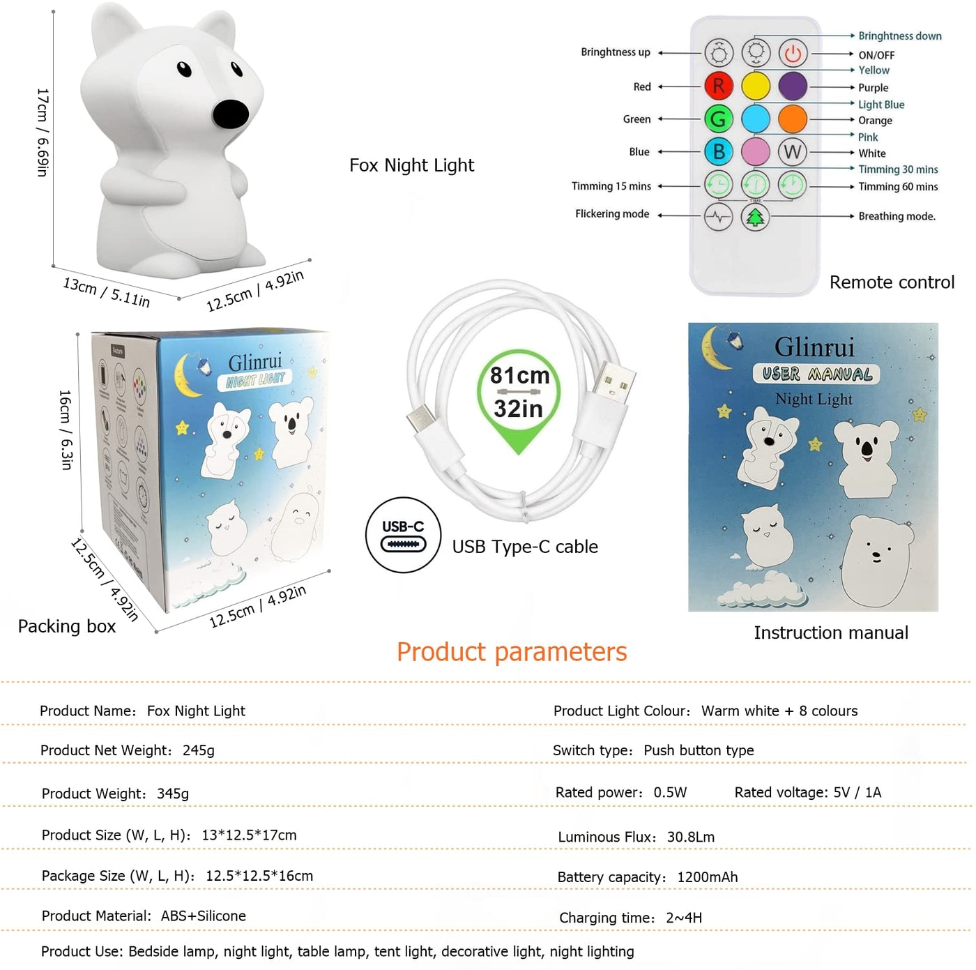 ?Big Size Fox Lamp?)Fox night light for kids Fox nightlights This multicolor kawaii anime light can not only decorate your kids bedroom, but also inspire the imagination with its various adorable appearences and changing colors. The Fox night lamp can be kids nice fellow, help them get rid of the fear of darkness, feel more at ease with a better sleep. Children can take it along as a moving light source when go in or out of rooms, feel more secure at night. It is also a baby night lights, soft enough to feed babies and change diapers at night without irritating to eyes. It can be used as portable lighting for travel and camping with durable battery. This is a very cute little night light for kids, children, Fox lovers and even adults. Its a touching gift for kids or friends on birthday, Christmas and other festivals,to decorate space, accompany growth, bring warmhearted moving to your linving space and beloved. Touch sensitive Fox lamp for brightness & color & timer control Perfect birthday or Christmas gift Battery operated night light for kids Kids Night Light for New Born Cute Gifts for Birthday Baby Teenage A Cute gift for babies and toddlers. Acts as a nursery night light and also for kids to learn about colors. Nursery Night Lights Best Gift for Kids A variety of cute animal images for your choice, can be your kids gifts for birthday, Christmas, etc. Kids will feel full love from mom and dad when open the exquisite wrap.