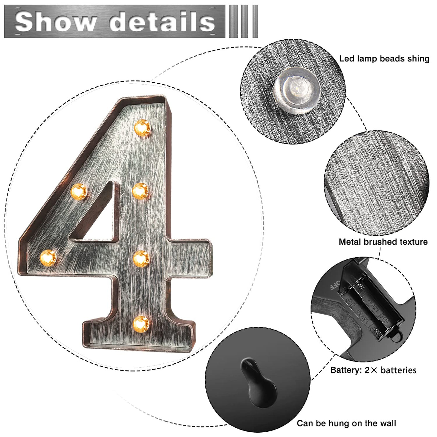 Brushed Silver Vintage Style LED Alphabet Letter Sign Specification 1. Size: 7.04 x 8.86 x 1.77 2. Battery: 2 x AA batteries required (not included) 3. Material: ABS Plastic. 4. Color of LEDS: Warm white Endless DIY possibilities: 1. Spell out any name or phrase with these fabulous light up alphabet letters! 2. Light up your favorite words for special occasion, event, or home decoration. Suitable for home, birthday party, outdoor, bars, cafes decorated. 3. An attention grabber and draw eyes as the apex of your wedding, party, special event, etc. Portable & Versatile. 1. Cordless battery operated. 2. Integrated hanging hook holes for ease of display on wall or just rest on dresser, shelf, table,picture window or bedside. 3. Can be displayed stand alone or combined with other pieces to create an eclectic lighting installation. Durable & Energy-Saving & Economic 1. LED bulb produces no heat after long-time use. 2. Plastic exterior, sturdy but not too heavy. ATTENTION 1. Store the light in a cool and dry place and remove batteries if product is not to be used for a long time. 2. Please handle this product with care to avoid damage to the bulbs.