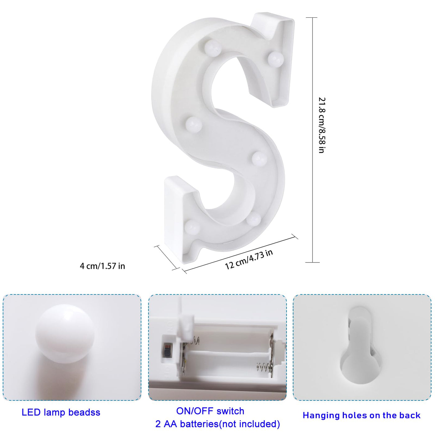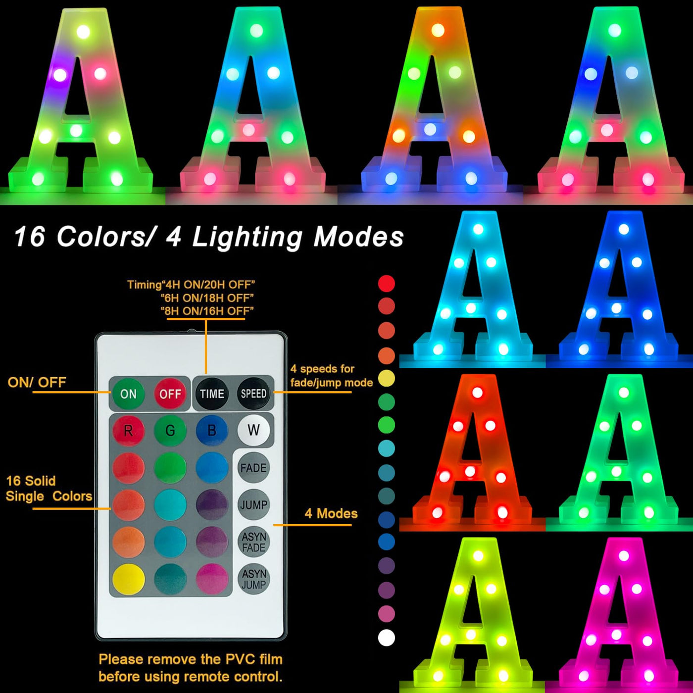 ?16 Colors Changing?The led marquee letter lights can be set to 16 different colors like red, orange, yellow, green, cyan, blue and purple (can steady-on modes), to meet your different decor needs. The changeable colors create a festive or romantic mood, a cheerful feel or something else just depending on your settings. | ?Specification?Size approx(W x H x D):9.01 x8.86 x1.77 . Made environmental ABS + PP material. | ?RGB REMOTE CONTROL?--- You can turn on the switch behind the letter and then use remote to control the light. Not only the ON/OFF, but also has TIME and SPEED function. Even more unique is that it can control 16 colors, and there are 4 lighting modes.(FADE, JUMP, ASYN FADE, ASYN JUMP) | ?DIY? COMBINATION ---ABCDEFGHIJKLMNOPQRSTUVWXYZ& 0-9 Digital 27 alphabetic character LED lights, you can choose the letter you want, combine them to create your own words to bright up your home. Like MARRY ME, BAR, READ, EAT, HAPPY BIRTHDAY and so on. | ?Widely Use?Perfect accessory to your home when you place this light on the table, desk, shelf. Ideal for your nursery room, office, pavilion and bedroom for wedding party, Christmas, New Year, birthday, festival, bar decor.
