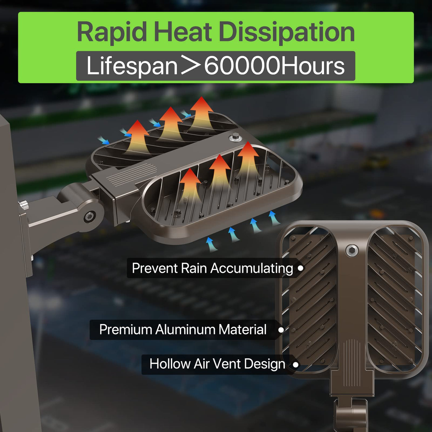 Illuminate your outdoor spaces with the Demilare 150W LED Parking Lot Light, delivering 22,500 lumens at 5000K daylight white for bright, efficient illumination. Engineered with 150LM/W efficiency, it replaces 500W metal halide or HPS lights, reducing energy consumption by over 85%. Equipped with a dusk-to-dawn photocell, this light automatically turns on at night and off in the morning, providing effortless operation and cost savings. The IP65 waterproof all-aluminum construction ensures durability, excellent heat dissipation, and a 60,000-hour lifespan, making it ideal for parking lots, driveways, roadways, and commercial areas. Installation is simple with the adjustable arm mount, allowing for versatile positioning to optimize lighting coverage. ETL-listed for safety and backed by a 5-year warranty, the Demilare 150W LED parking lot light is a long-lasting, energy-efficient solution for outdoor lighting needs