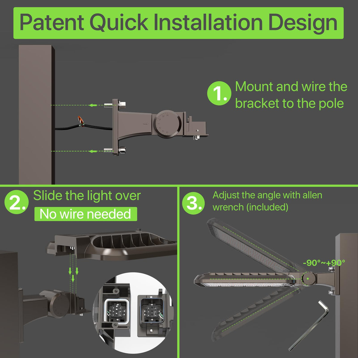 Q: How easy is it to install the Glitgate Parking Lot Light?A: The light features a patent quick installation design that requires no wiring to connect the light body and bracket. Simply install the bracket on the wall and slide the light over, making it user-friendly and efficient.