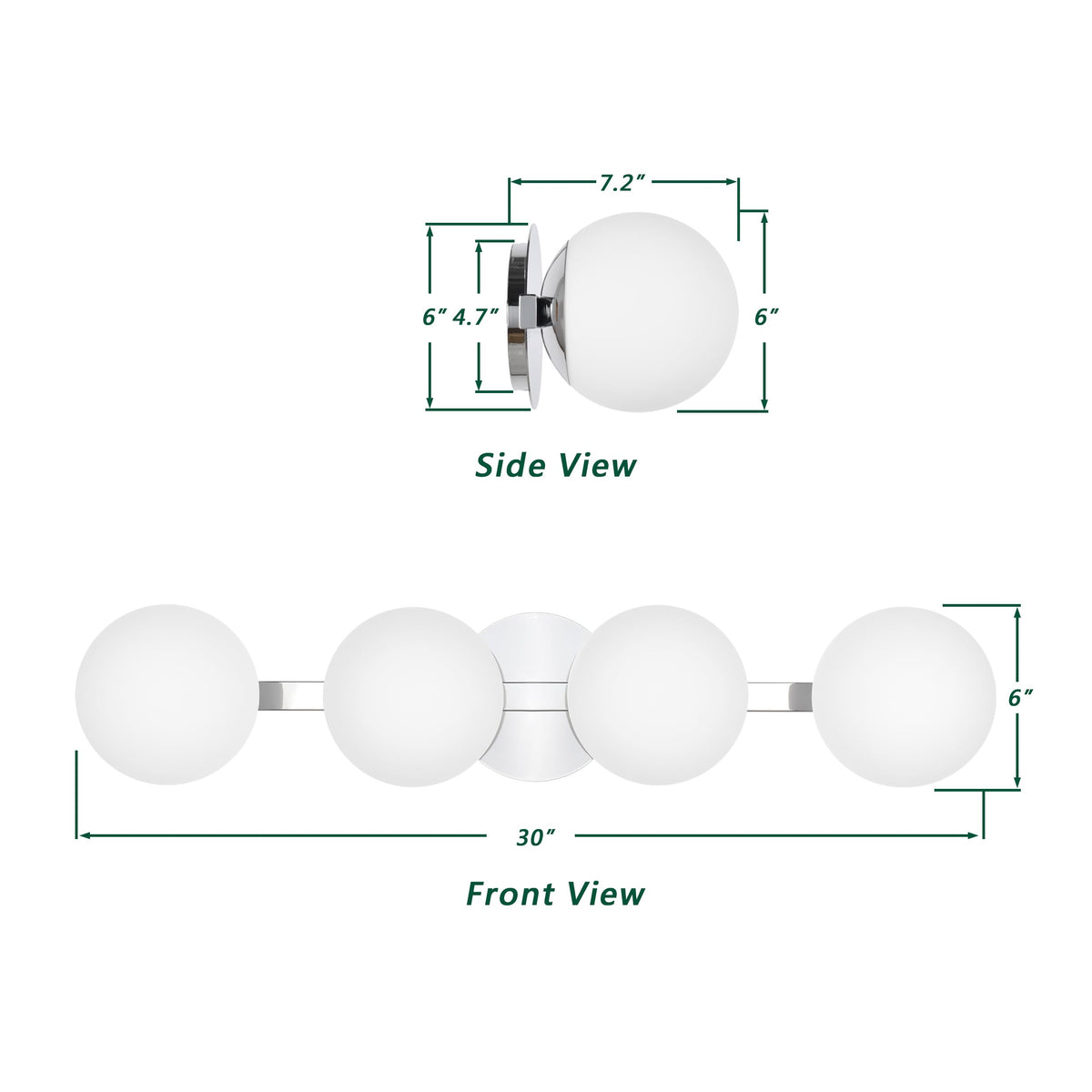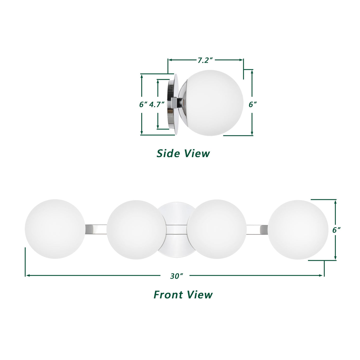 The Perfect 4-Light Bathroom Vanity Light Fixtures Style: Modern / Metro Finish: Chrome Material: Metal & Glass Dimensions: 30 W x 6 H x7.2 D Bulb Requirements: This bathroom vanity light fixture uses four medium-based E26 bulb (not included) and is fully dimmable when used with a dimmable bulb and compatible dimmer switch Max Wattage: 4x60W Installation: Hardwire