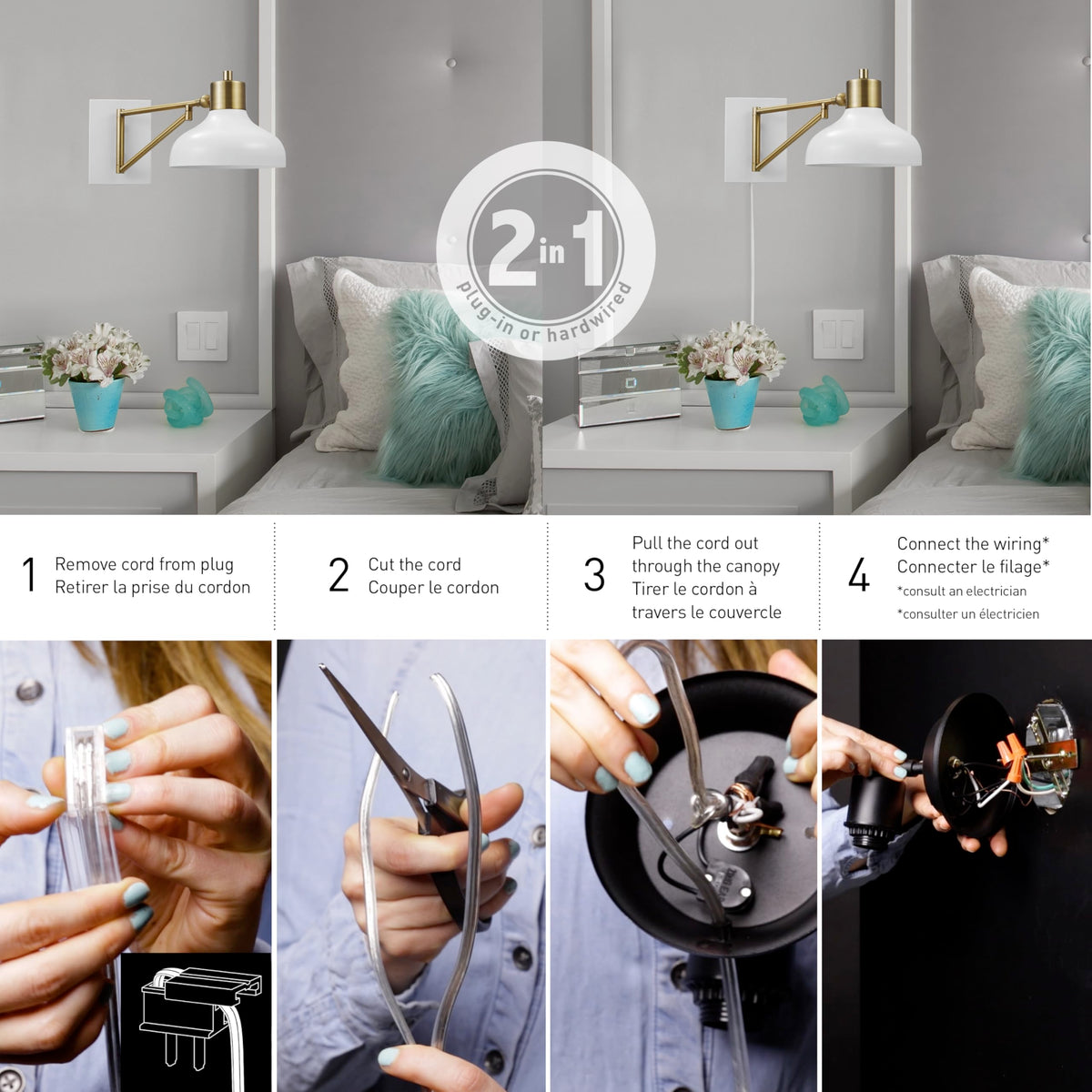 Globe Electric 51344 1-Light Plug-In Or Hardwire Swing Arm Wall Sconce, White, Brass Accents, White-Cloth Cord, Mounted Bedside