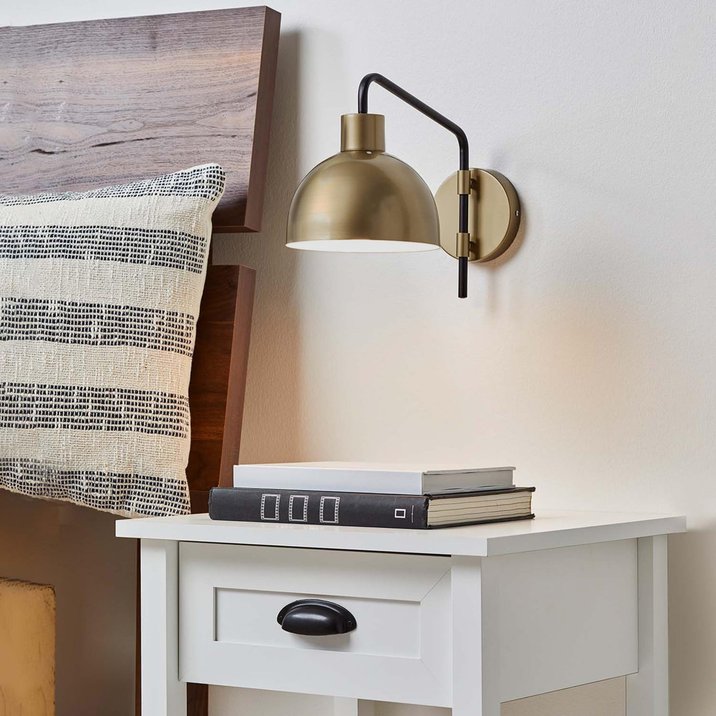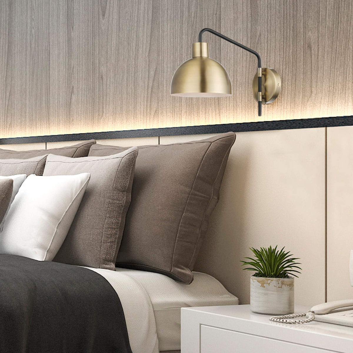 The timeless Globe Electric Dimitri Plug-In or Hardwire Wall Sconce is the perfect accessory. With a stunning antique brass finish and bowl shade, this metallic wall sconce brings a vintage industrial feel to any room. The 7-inch shade is perfect to reflect the light while the sculptural arm completes the industrial look. Using a vintage filament bulb will play up the vintage feel or modernize your sconce with a Smart bulb and have light at your fingertips. Plus, you're not restricted by the need for an existing hardwire connection - simply use the six-foot cord to place your sconce anywhere there's an outlet. The options are endless!