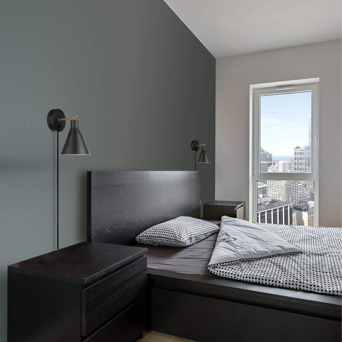 The Tristan Collection by Globe Electric offers modern design for every d?or style. With a trendy cone shade and a stepless rotary dimmer switch, this plug-in or hardwire wall sconce offers ideal lighting for any time of the day. Perfect for a living room, bedroom, home office or den, the matte black finish and faux wood accent bar offers a lofty chic style that complements your existing decor. The stepless rotary dimmer switch allows you to seamlessly move through different levels of light to choose what you need for any given situation. Plug it in or hardwire it in place and enjoy unique lighting for years to come.