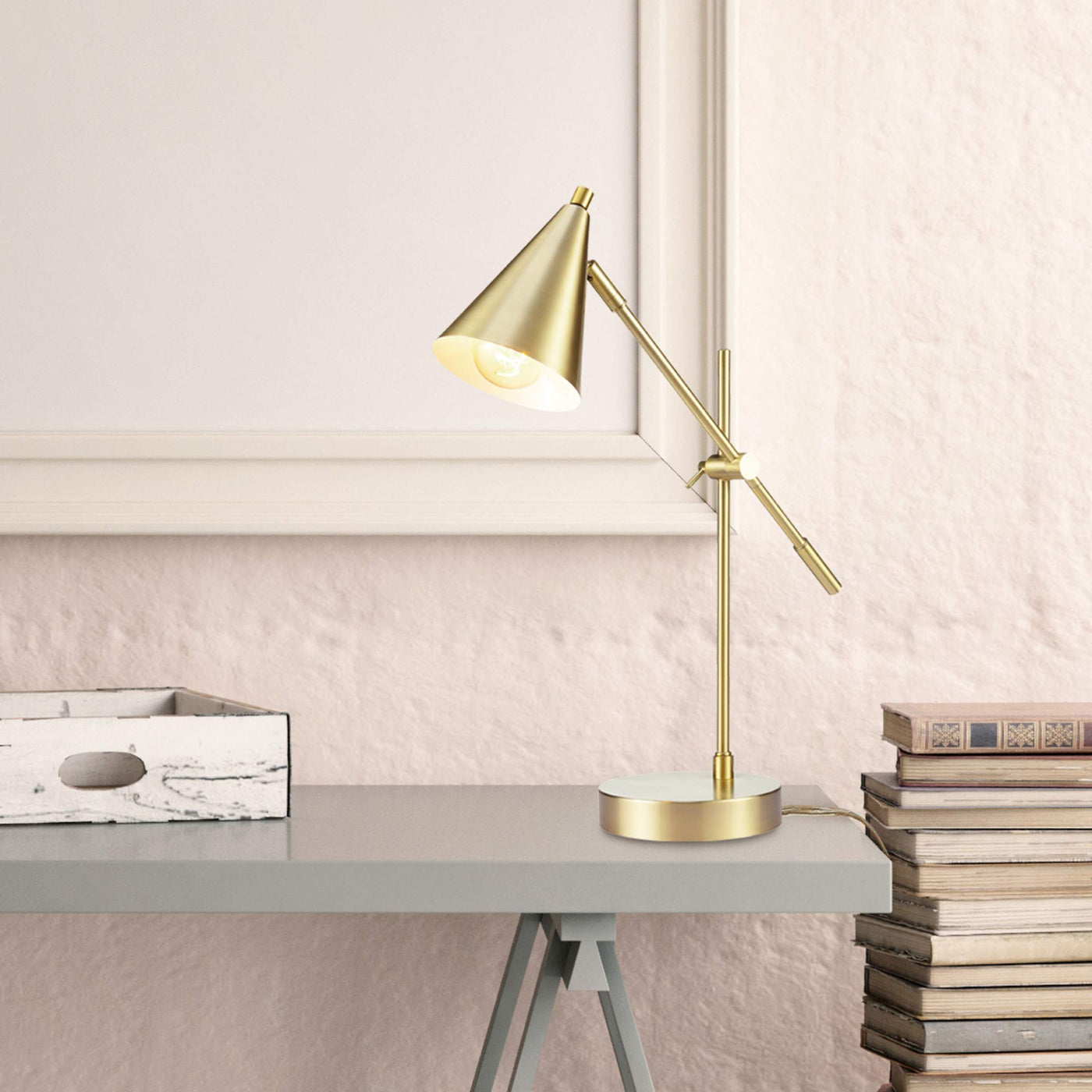 Illuminate your space with the Tacoma Desk Lamp from Novogratz x Globe Electric, a perfect blend of style and functionality. This modern lighting solution features a trendy cone-shaped shade and a chic matte brass finish, making it a stunning addition to any room. With its adjustable brass balance arm and tilting lamp head, you can easily direct light exactly where you need it, creating the ideal ambiance for work or relaxation. The sculptural design not only serves as a practical task light but also acts as a statement piece that enhances your interior decor.