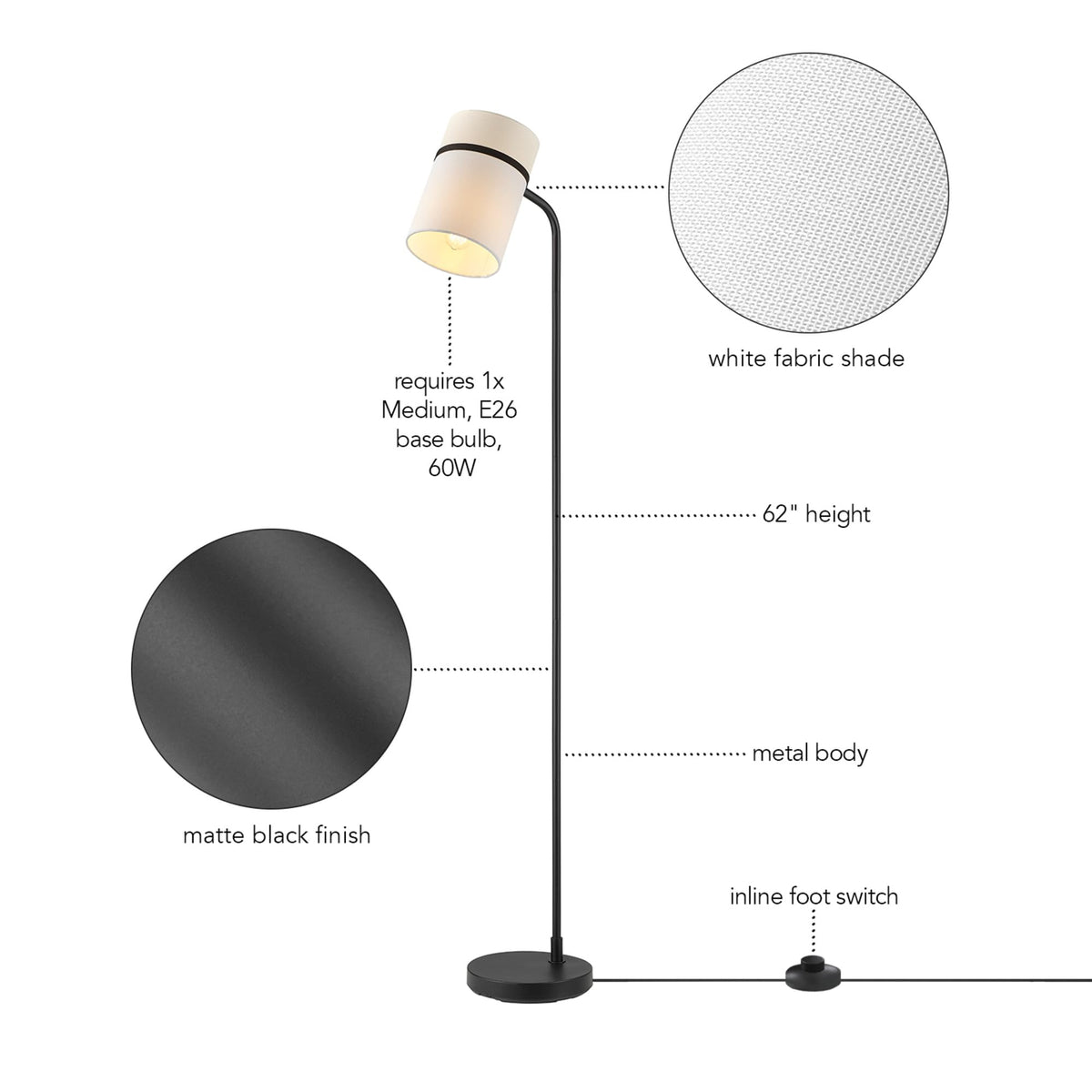 Globe Electric 61000145 62'' Floor Lamp, Matte Black, White Fabric Shade, In-Line Of/Off Foot Switch, 6-Foot Black Cord, Reading