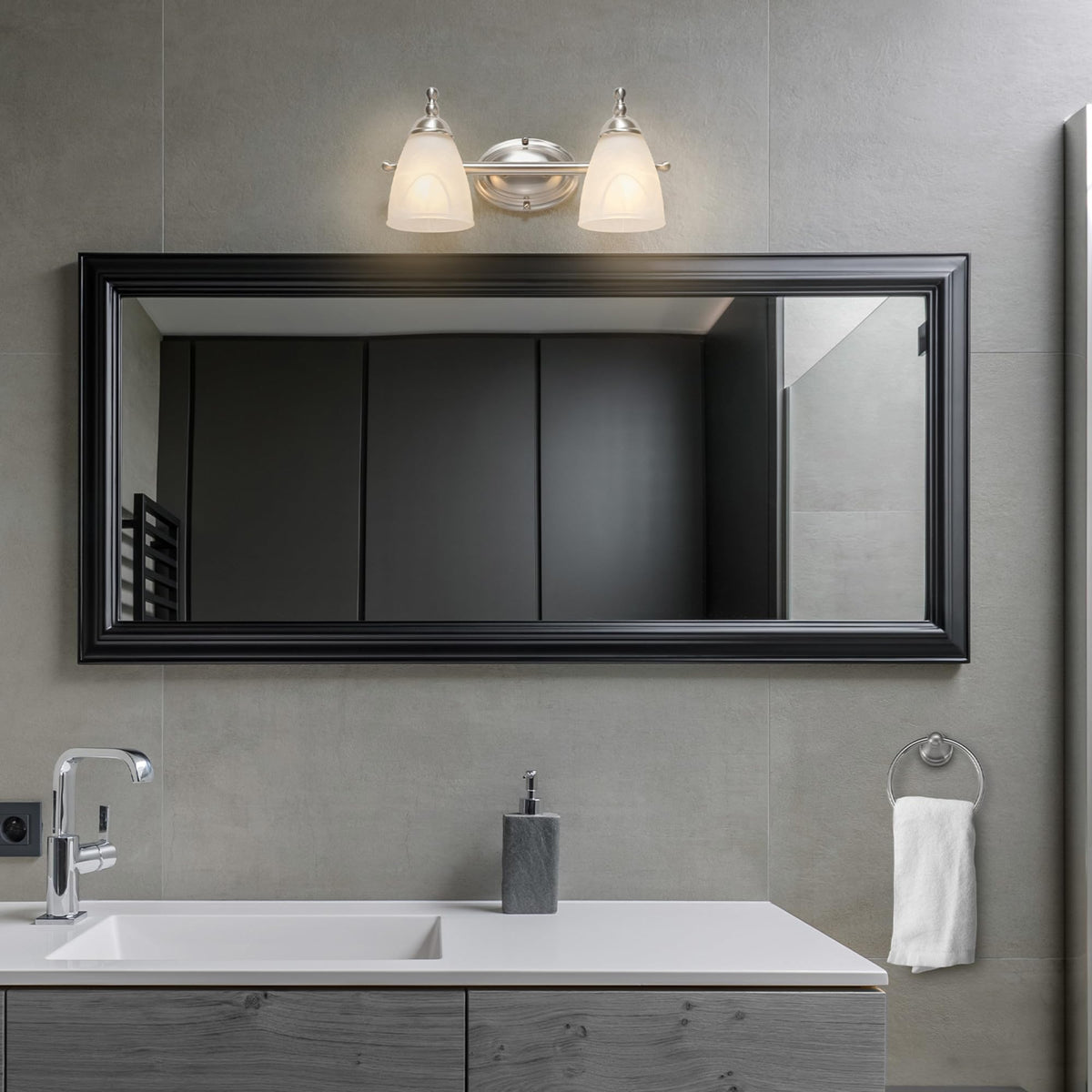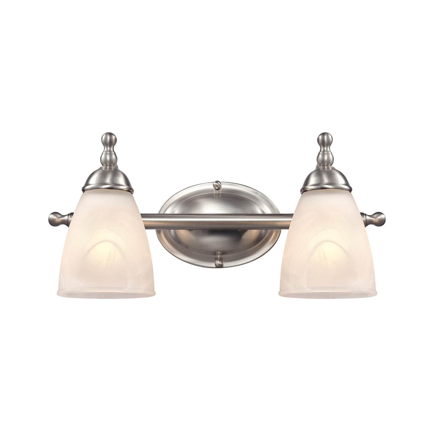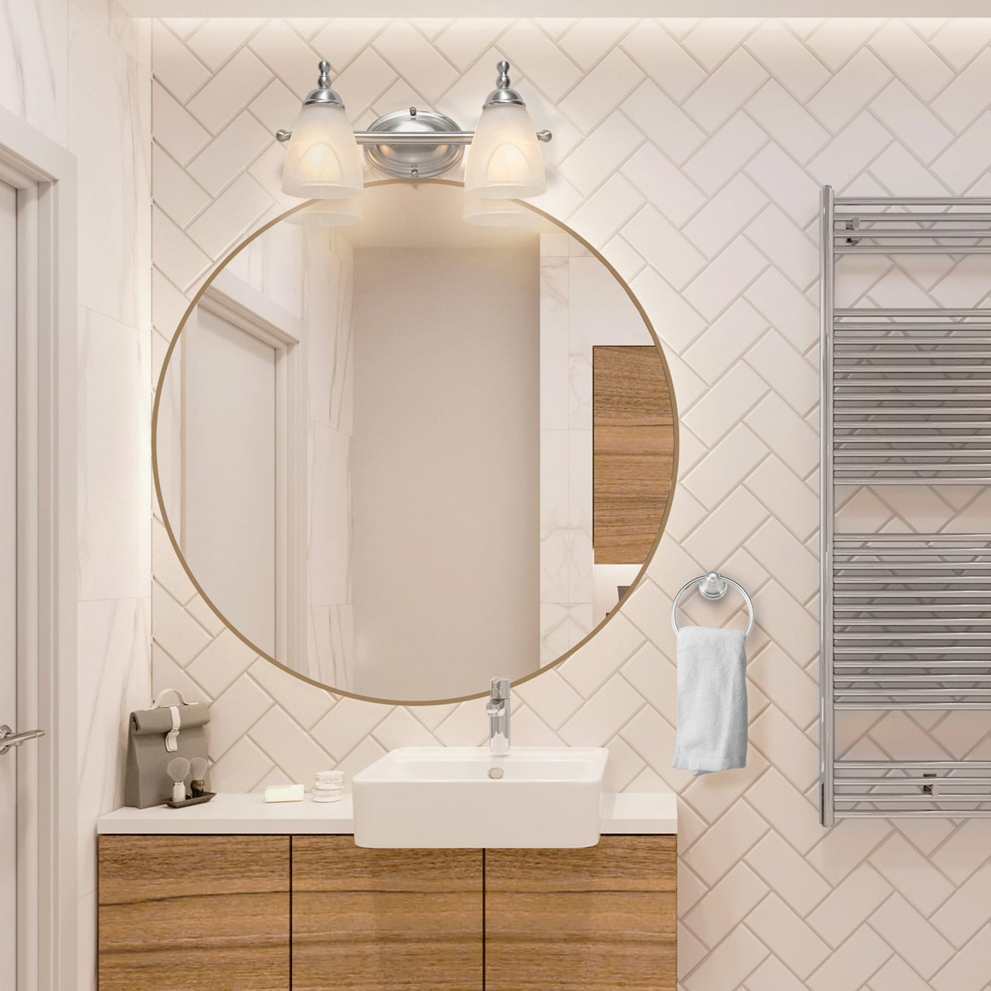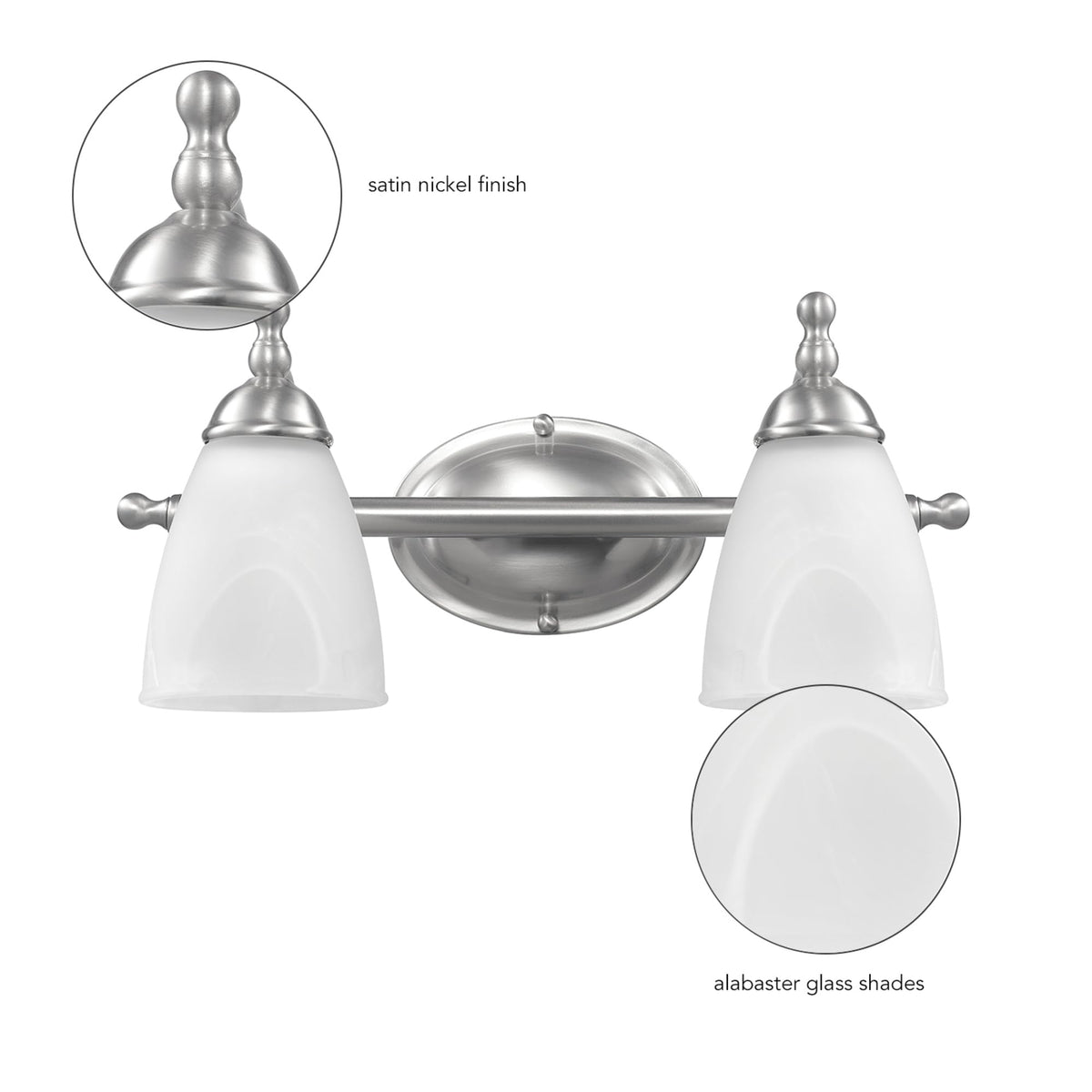 Vanity lighting is a great way to illuminate your bathroom or makeup counter but let's not stop there. This Satin Nickel 2-Light Vanity Light, with a matching toilet paper holder and towel ring, works in so many spaces, the hardest decision you'll have to make is where to place them - ideal for installing in your bathroom, kitchen, powder room, or bedroom. With a variety of different medium-based vintage Edison and designer bulbs to choose from, Globe Electric allows you to customize the feel of this fixture to best suit your individual style and taste. Thanks to the alabaster glass shades you will always have a diffused light for your space, even when choosing a bright, high lumen bulb. Couple this with a compatible dimmer switch to create the perfect atmosphere for any mood you're in (dimmer switch not included).