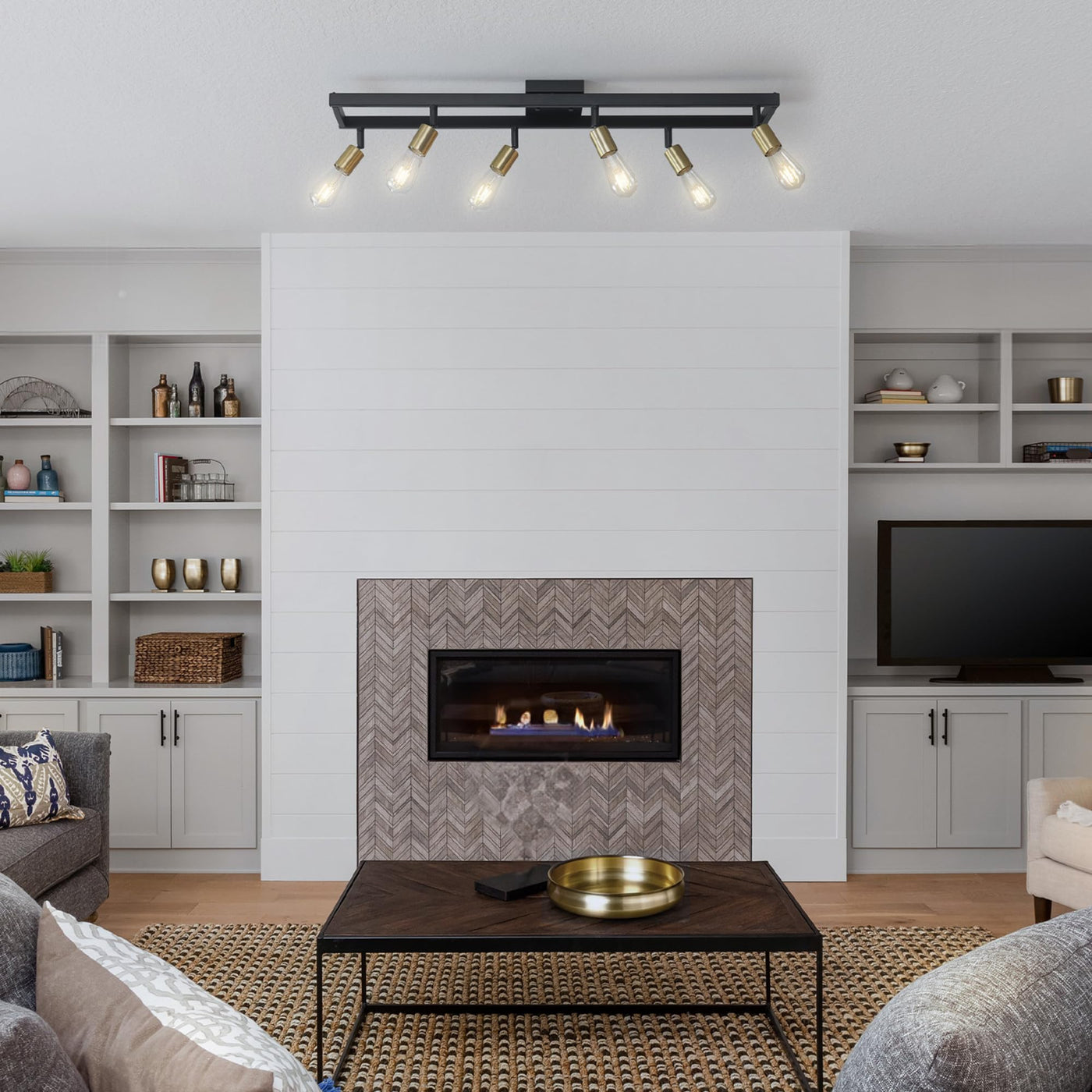 Q: What style of decor does this track lighting complement?A: The matte black and matte brass finish of the track lighting complements a range of styles but is particularly suited for industrial farmhouse designs, enhancing the overall aesthetic of living rooms, kitchens, dining rooms, and more.