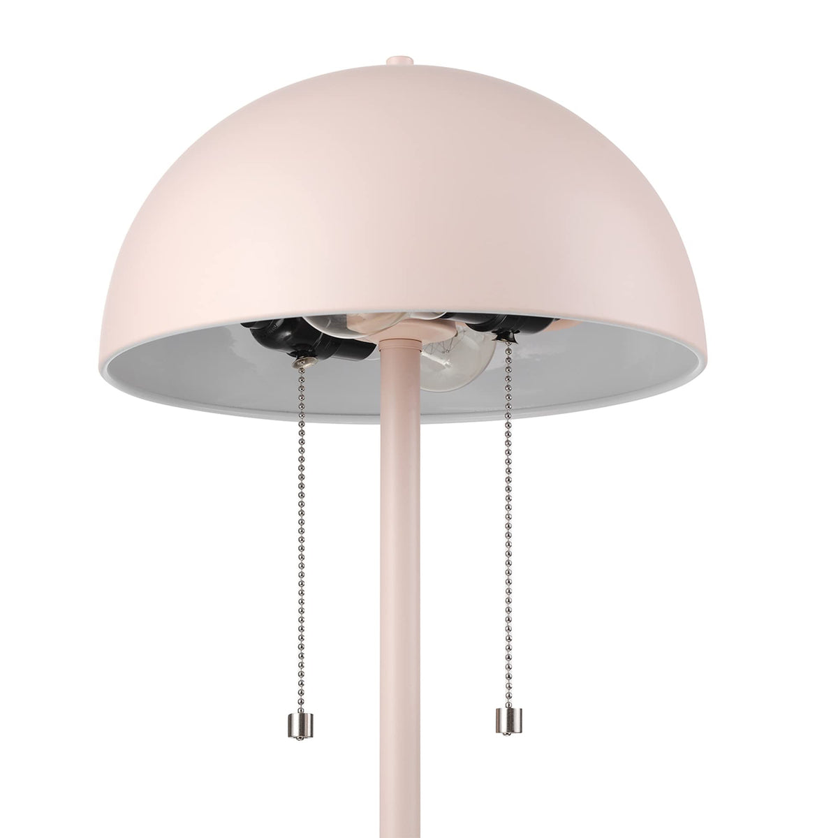 Q: What materials is the Globe Electric Luna Table Lamp made of?A: The Luna Table Lamp is constructed from high-quality metal, ensuring durability and a modern aesthetic. The combination of the matte blush pink finish and plated nickel pull chains adds to its elegant design.